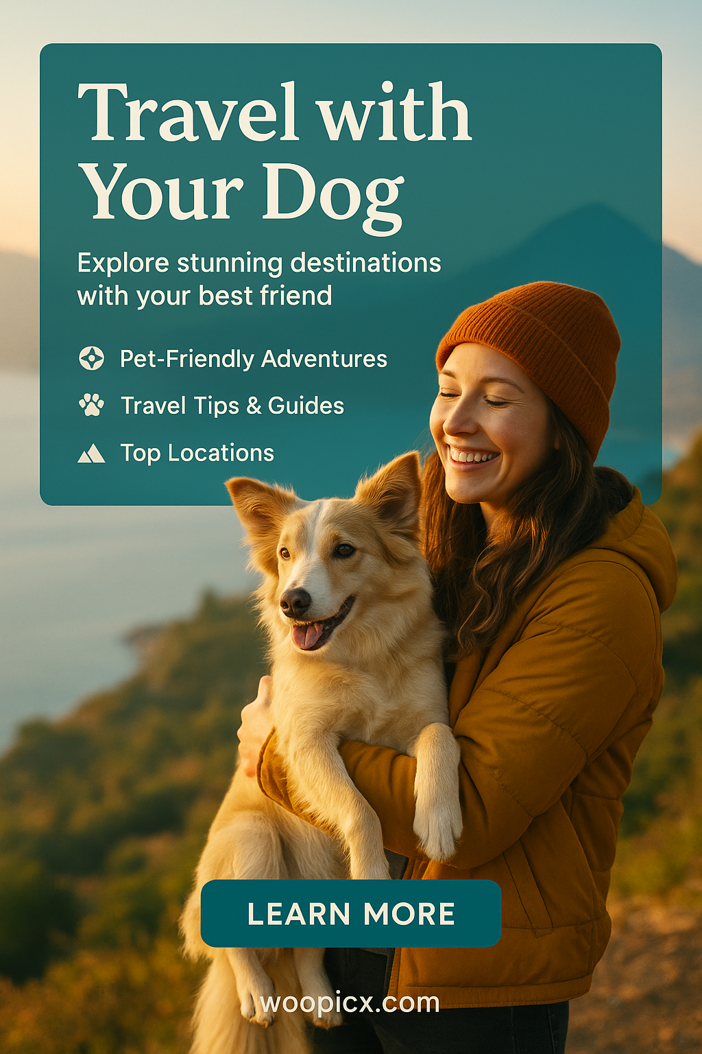 Promotional Travel Guide for Dog Owners Featuring Scenic Outdoor Adventure