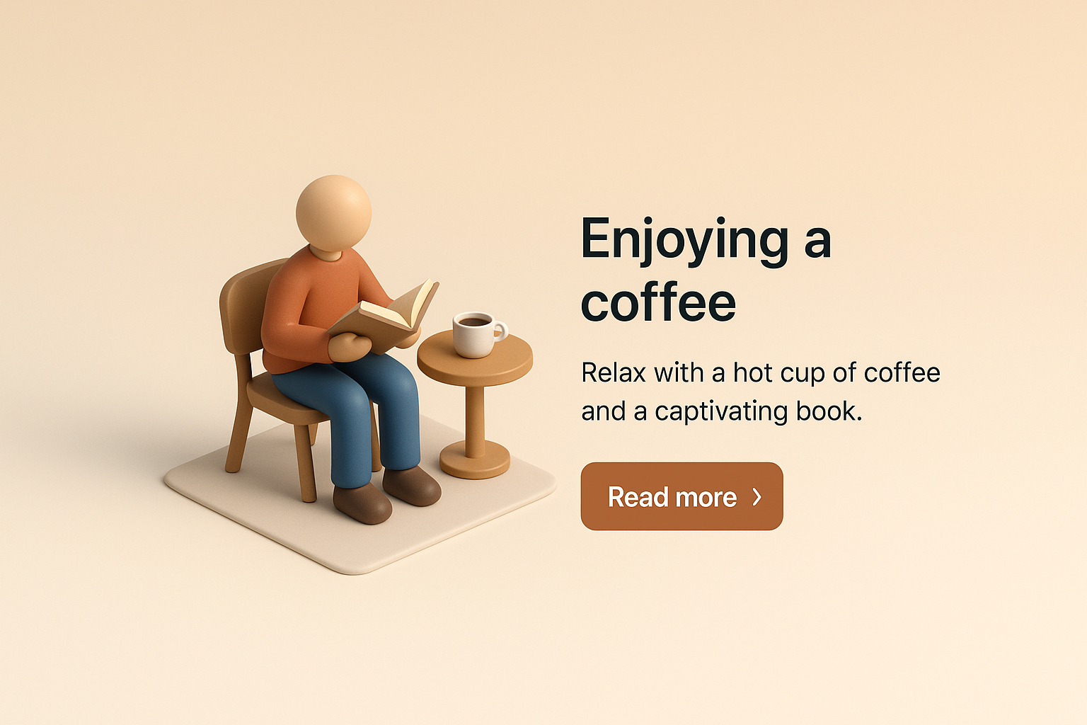 A serene 3D scene featuring a minimalist character reading a book while enjoying a cup of coffee. The background has a smooth gradient, enhancing the cozy atmosphere.