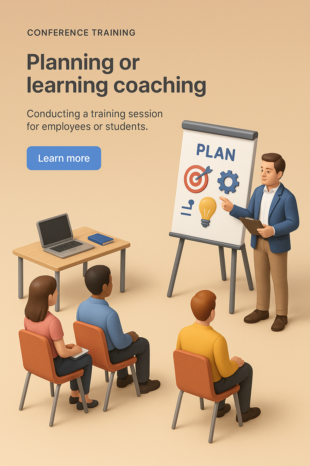 /Collection: /by davooda/Type: PNG/A detailed 3D illustration depicting a conference training session. A presenter stands beside a whiteboard, engaging with seated attendees, showcasing a training environment.