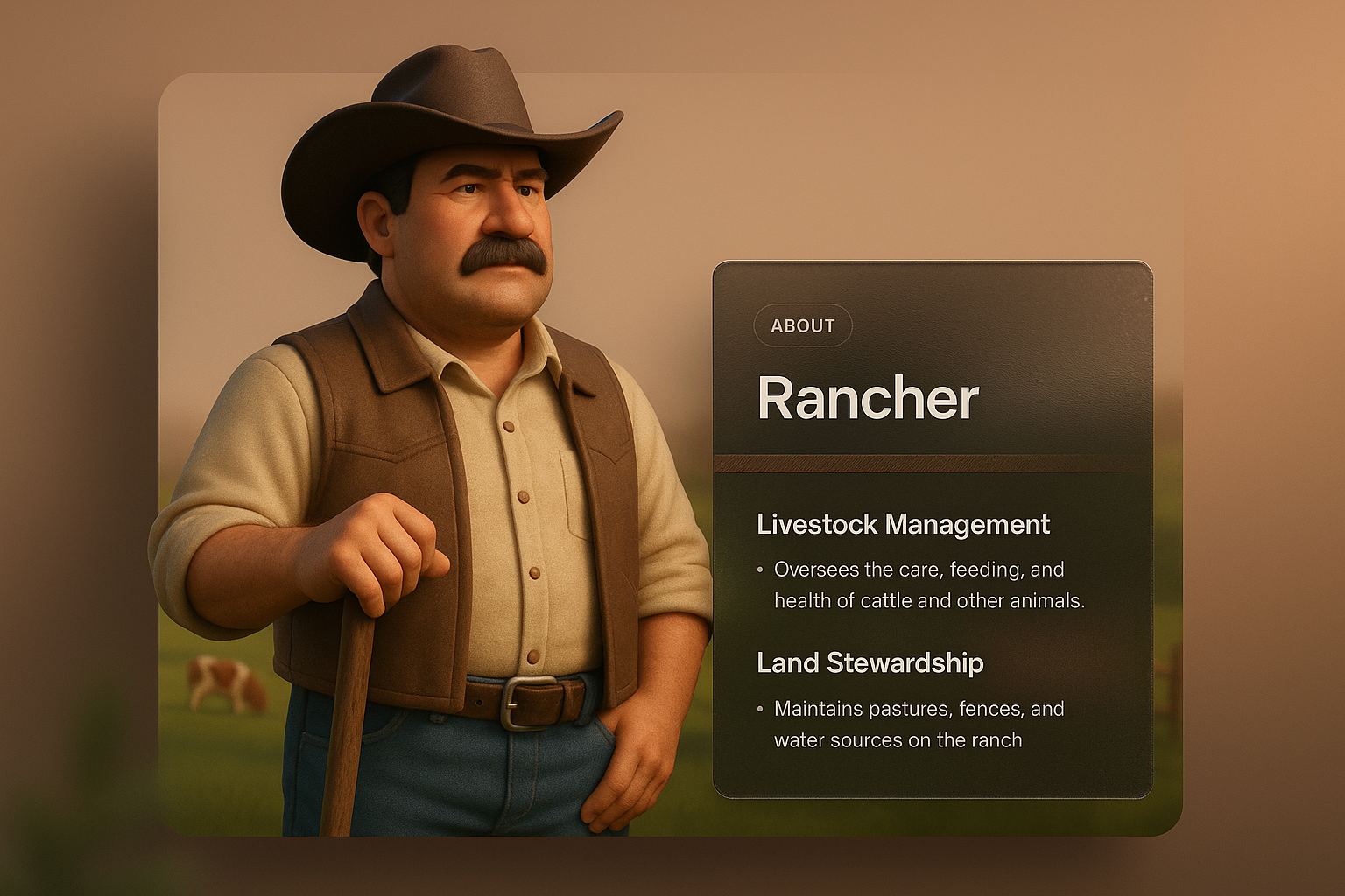 /Collection: /by davooda/Type: PNG/A 3D illustration of a rancher character stands prominently against a smooth gradient background. Integrated design blocks provide information about livestock management and land stewardship, enhancing the visual appeal.