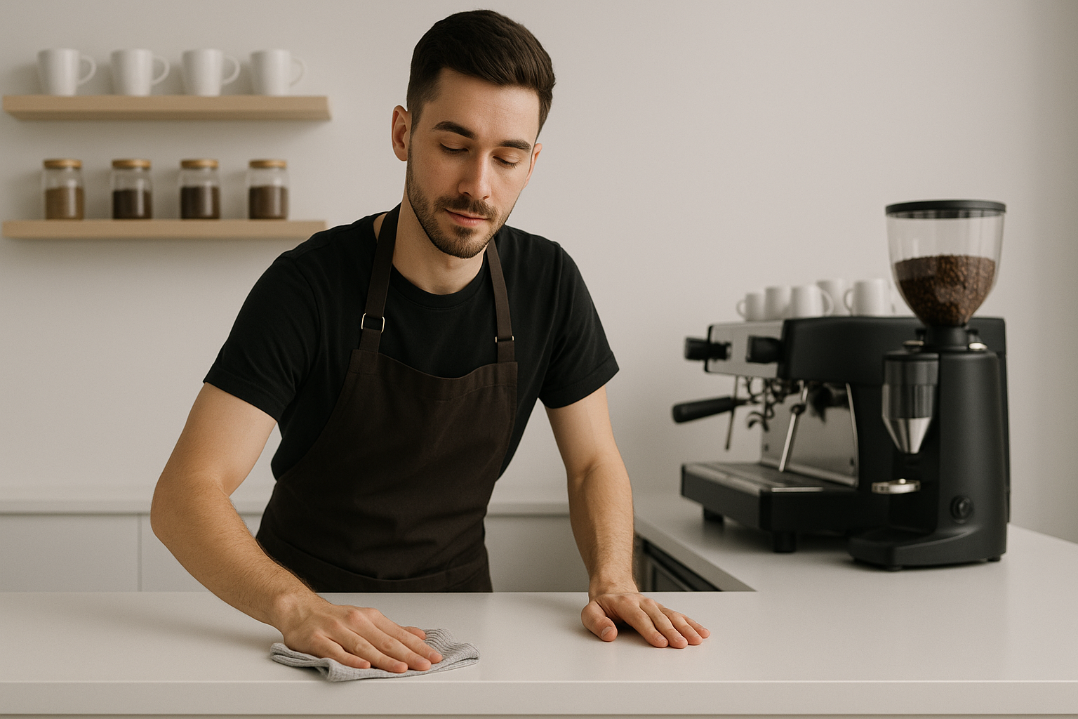 Barista Cleaning Stylish Counter in Minimalist Cafe