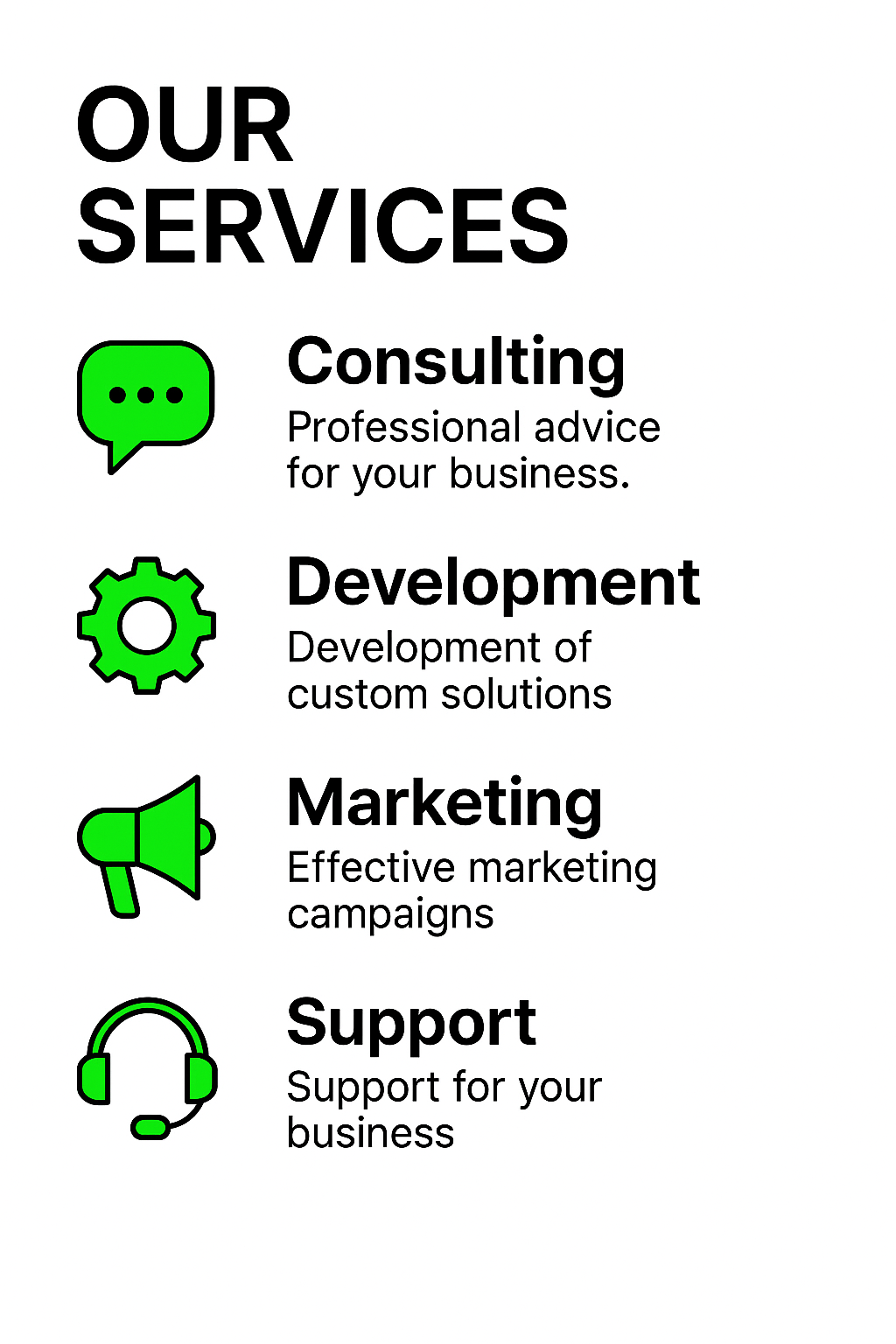 Informative graphic showcasing a list of services with corresponding icons, designed for business presentations or marketing materials.