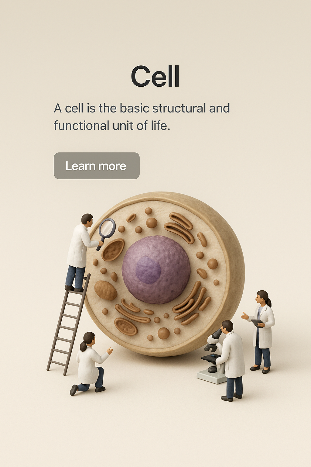 /Collection: /by davooda/Type: PNG/A zoomed-out 3D illustration of a cell featuring tiny characters interacting around it. The scene includes a gradient background and clear text elements for readability.