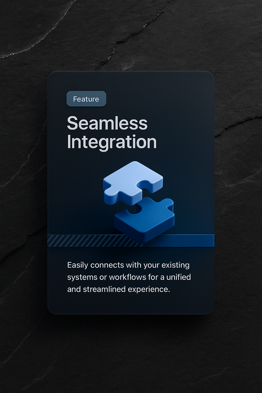 /Collection: /by davooda/Type: PNG/A dark grey slate background features a 3D illustration of two interlocking puzzle pieces. The design showcases a sleek feature block with a title and descriptive text.