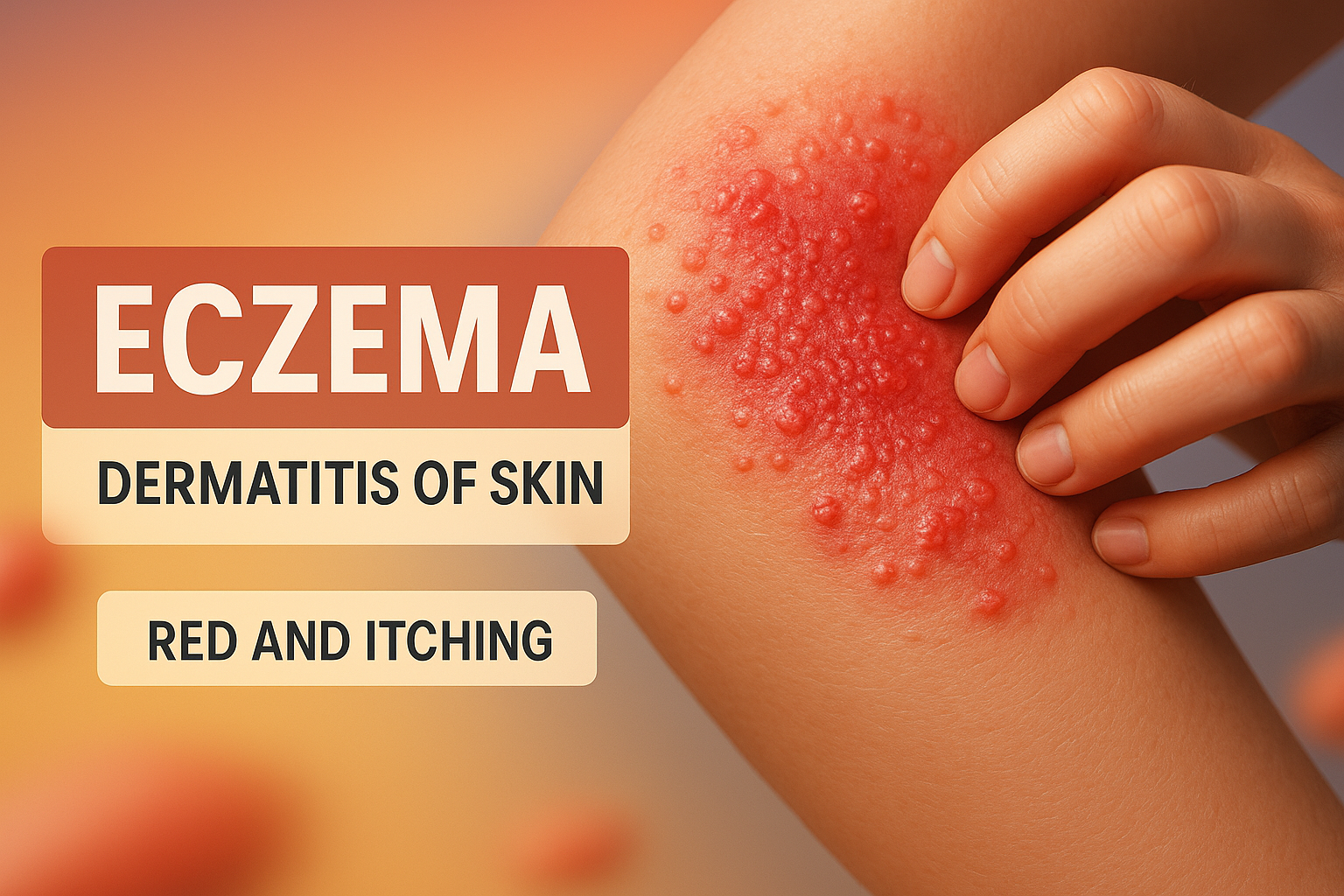 A medical illustration depicting eczema on human skin, showcasing red, irritated patches. Ideal for educational materials related to dermatology and skin health.