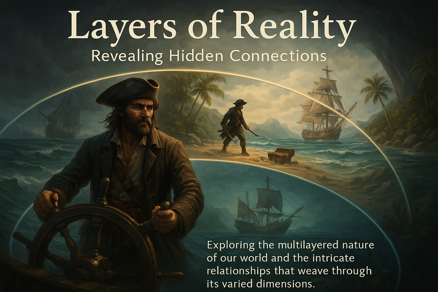 /Collection: /by davooda/Type: PNG/An intricate composition showcasing a pirate navigating through layered scenes, revealing hidden connections within diverse dimensions of reality. Each layer is richly detailed.