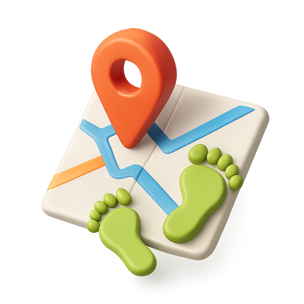 A vibrant 3D icon featuring a map with colorful path lines, a location pin, and green footprints, designed in an isometric style for a modern look.