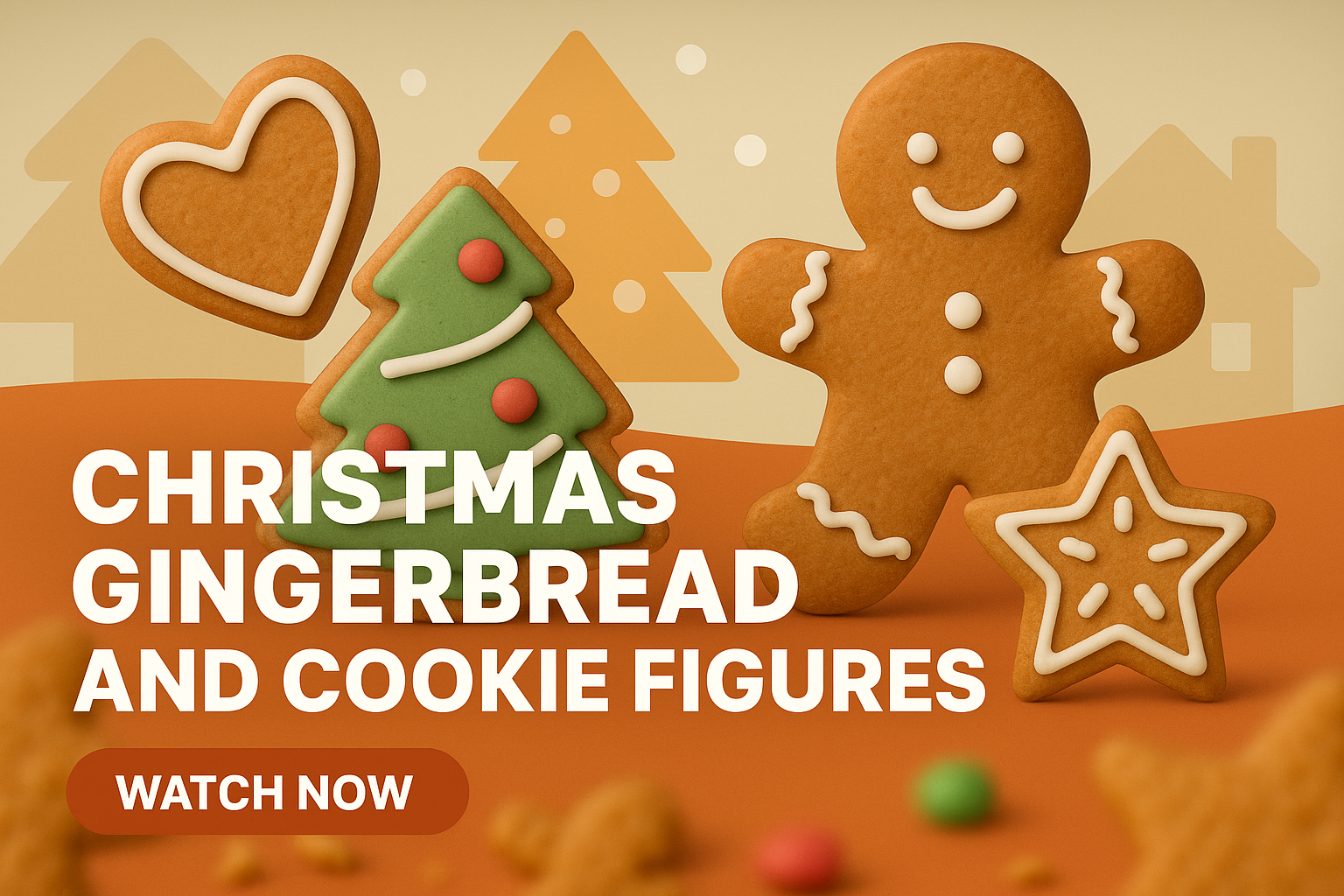 Charming image of decorated gingerbread cookies including a tree, star, and gingerbread man, set against a warm background, perfect for holiday promotions or baking content.
