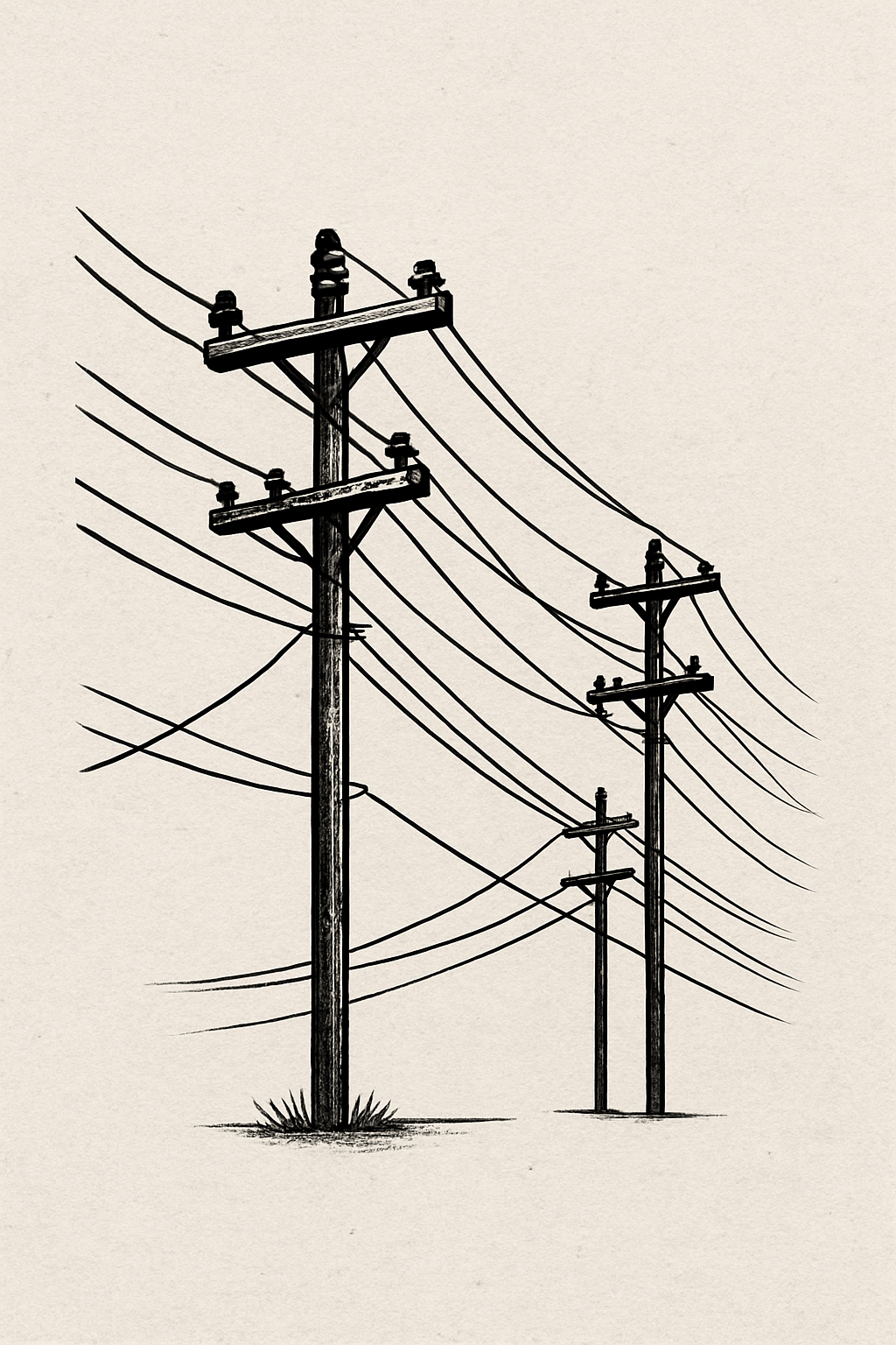 A minimalist illustration of utility poles and power lines, capturing a sense of simplicity and industrial aesthetics. Ideal for design projects and artistic displays.