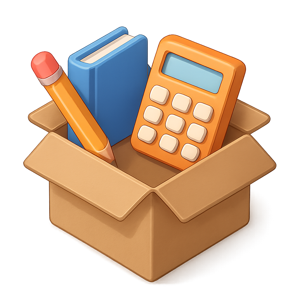 A 3D illustration of an open cardboard box containing a pencil, a blue book, and an orange calculator, set against a warm gradient background.