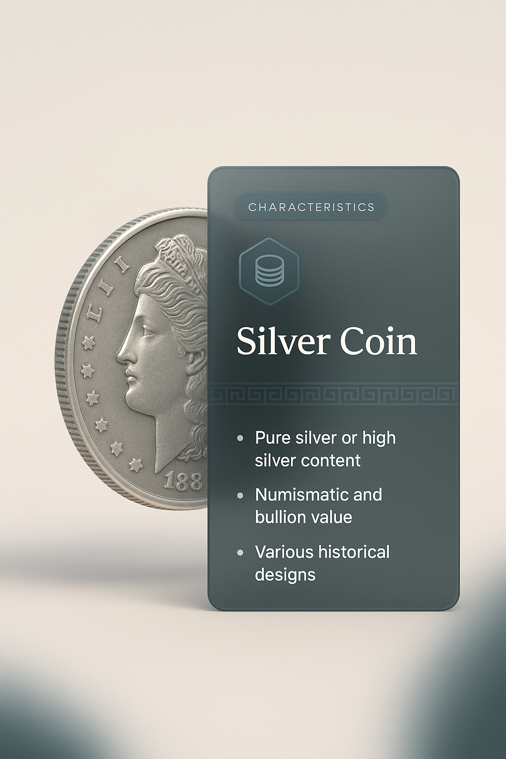 /Collection: /by davooda/Type: PNG/A 3D illustration showcasing a silver coin with a detailed overlay card. The card provides information about the coin's characteristics and value, designed with a modern aesthetic.