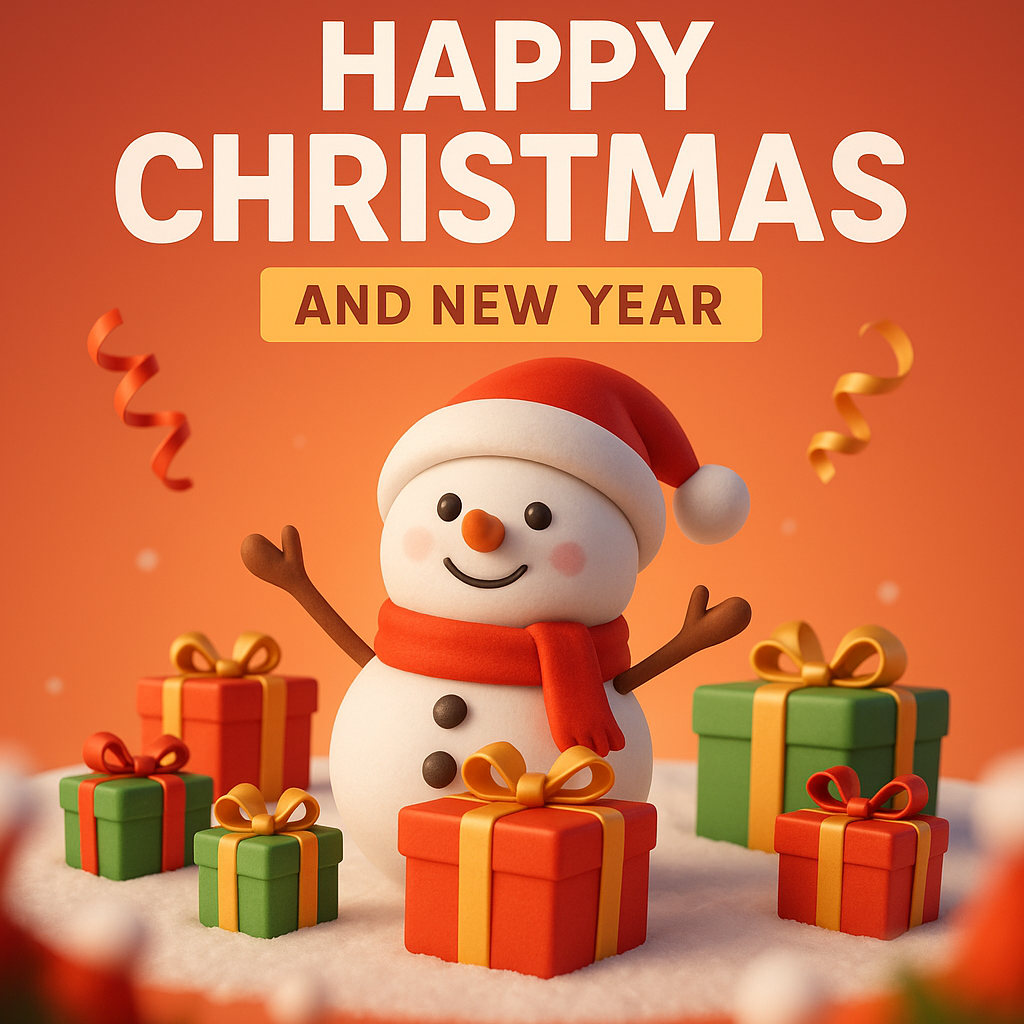 A vibrant digital illustration of a snowman celebrating Christmas and New Year, surrounded by colorful gift boxes. Perfect for holiday-themed promotions.