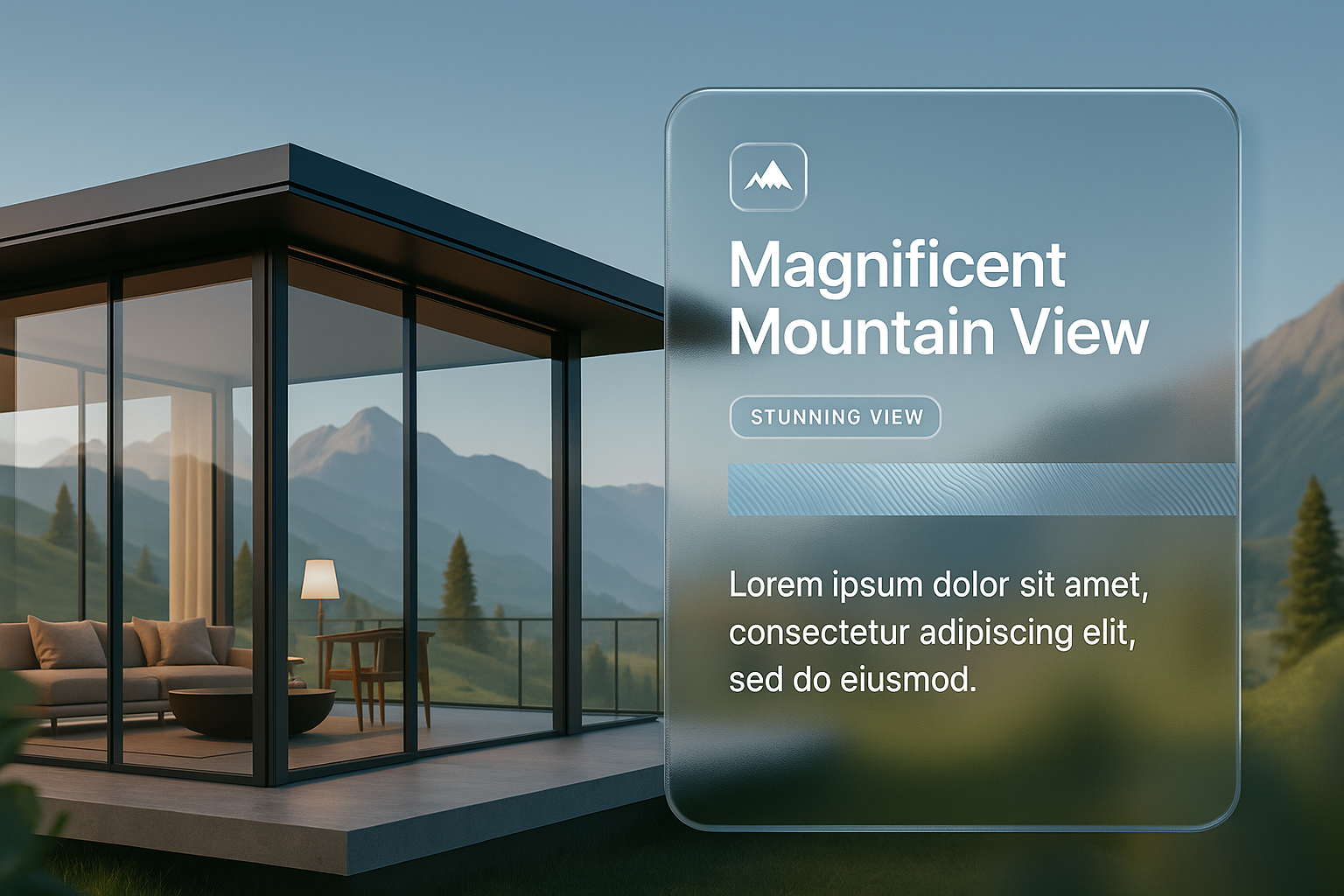 /Collection: /by davooda/Type: PNG/A modern luxury villa features expansive glass walls, offering breathtaking mountain views. The minimalist design harmonizes with the serene natural environment, perfect for luxurious glamping.
