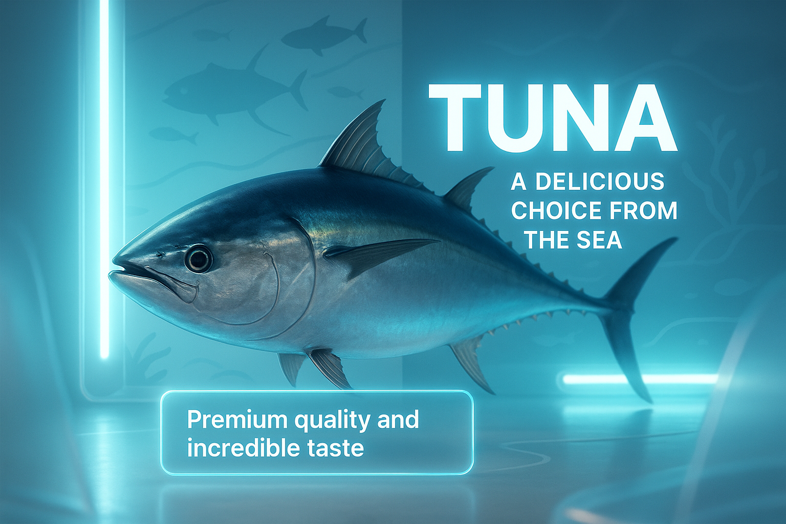 Visually striking 3D rendered image of a tuna fish, emphasizing its premium quality and taste, suitable for seafood marketing and culinary promotions.