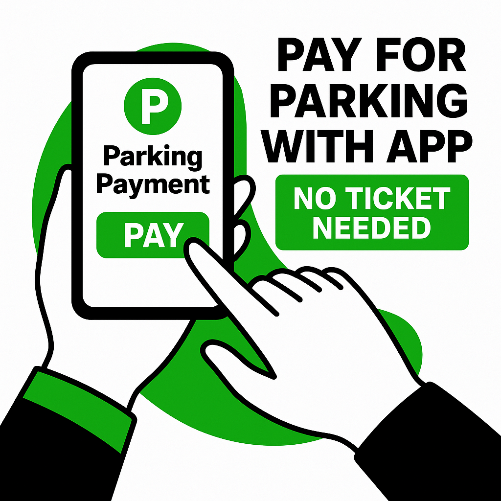 /Collection: /by davooda/Type: PNG/Illustrative graphic promoting a mobile app for parking payments, featuring a hand interacting with a smartphone. The design uses bold colors and clear messaging, ideal for urban settings.