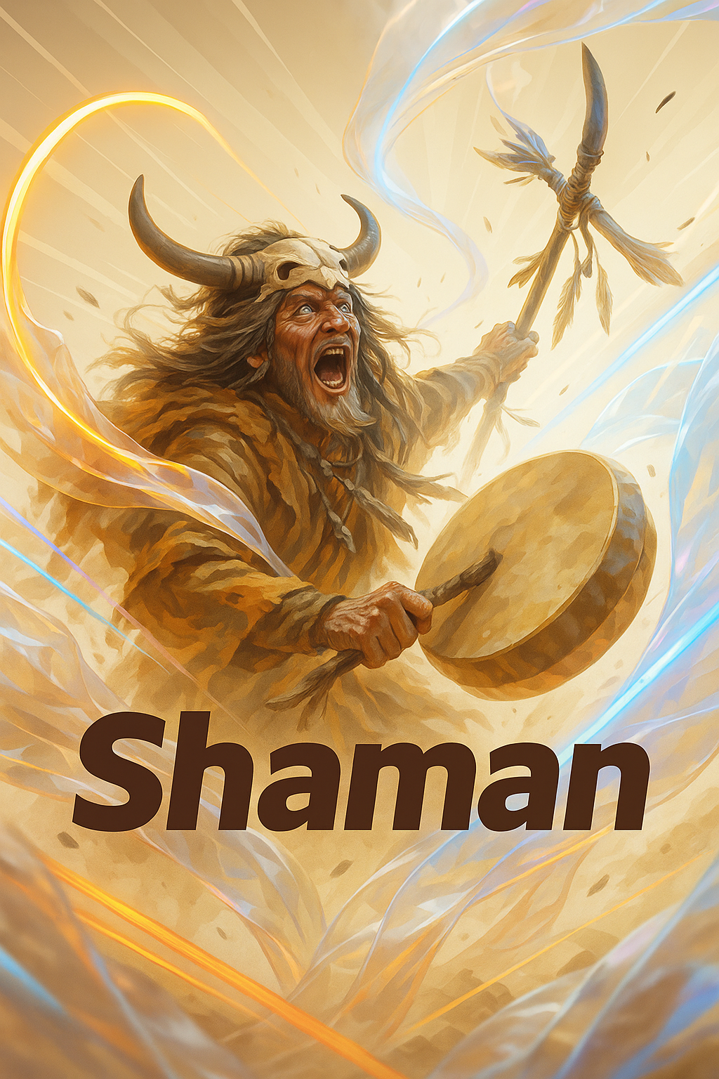 /Collection: /by davooda/Type: PNG/A vibrant depiction of a shaman energetically playing a drum, surrounded by flowing neon lights and soft haloes. The beige and brown tones create a mystical atmosphere, enhanced by translucent materials.