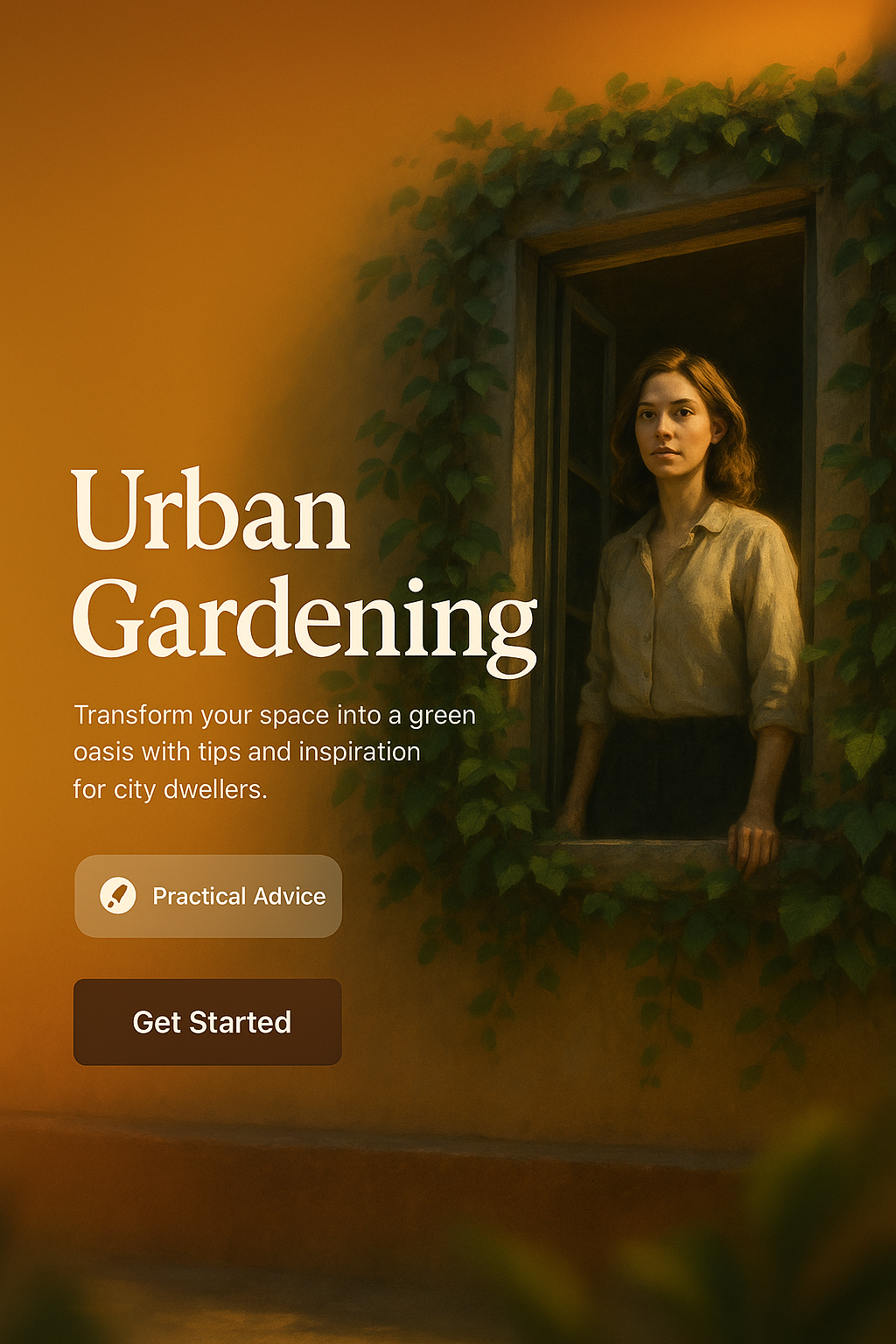 /Collection: /by davooda/Type: PNG/A visually engaging social media post promoting urban gardening, featuring a woman by a window. It combines warm colors and inviting design elements, targeting city residents seeking gardening inspiration.