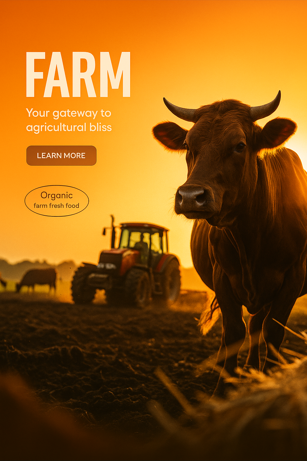 /Collection: /by davooda/Type: PNG/A captivating farm scene featuring a cow in the foreground and a tractor in the background, illuminated by a warm sunset glow. The composition emphasizes realism and depth.