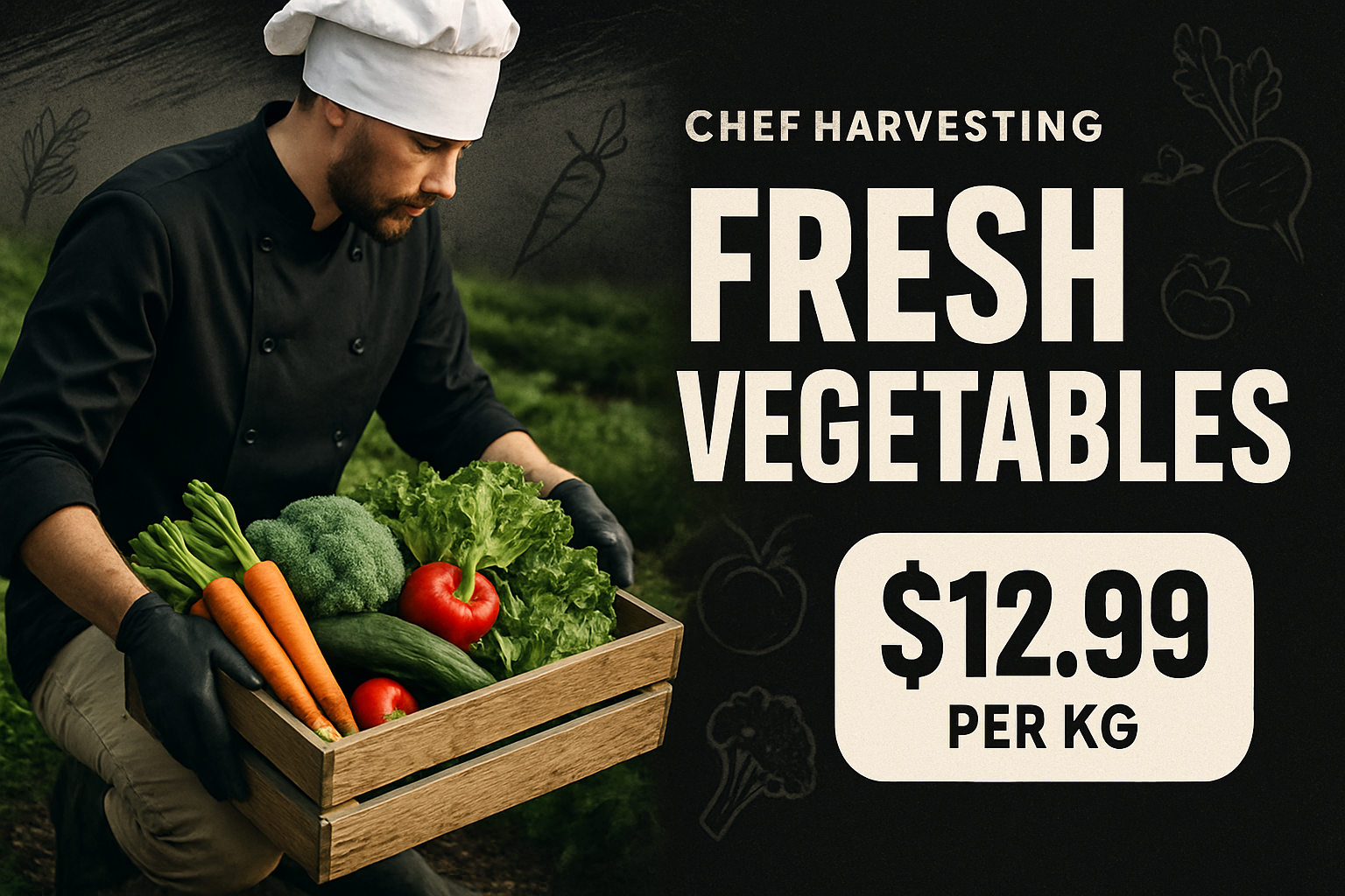 /Collection: /by davooda/Type: PNG/An advertisement featuring a chef harvesting fresh vegetables on a farm, with a modern layout and contrasting typography. The background includes light textures and contour drawings related to the theme.