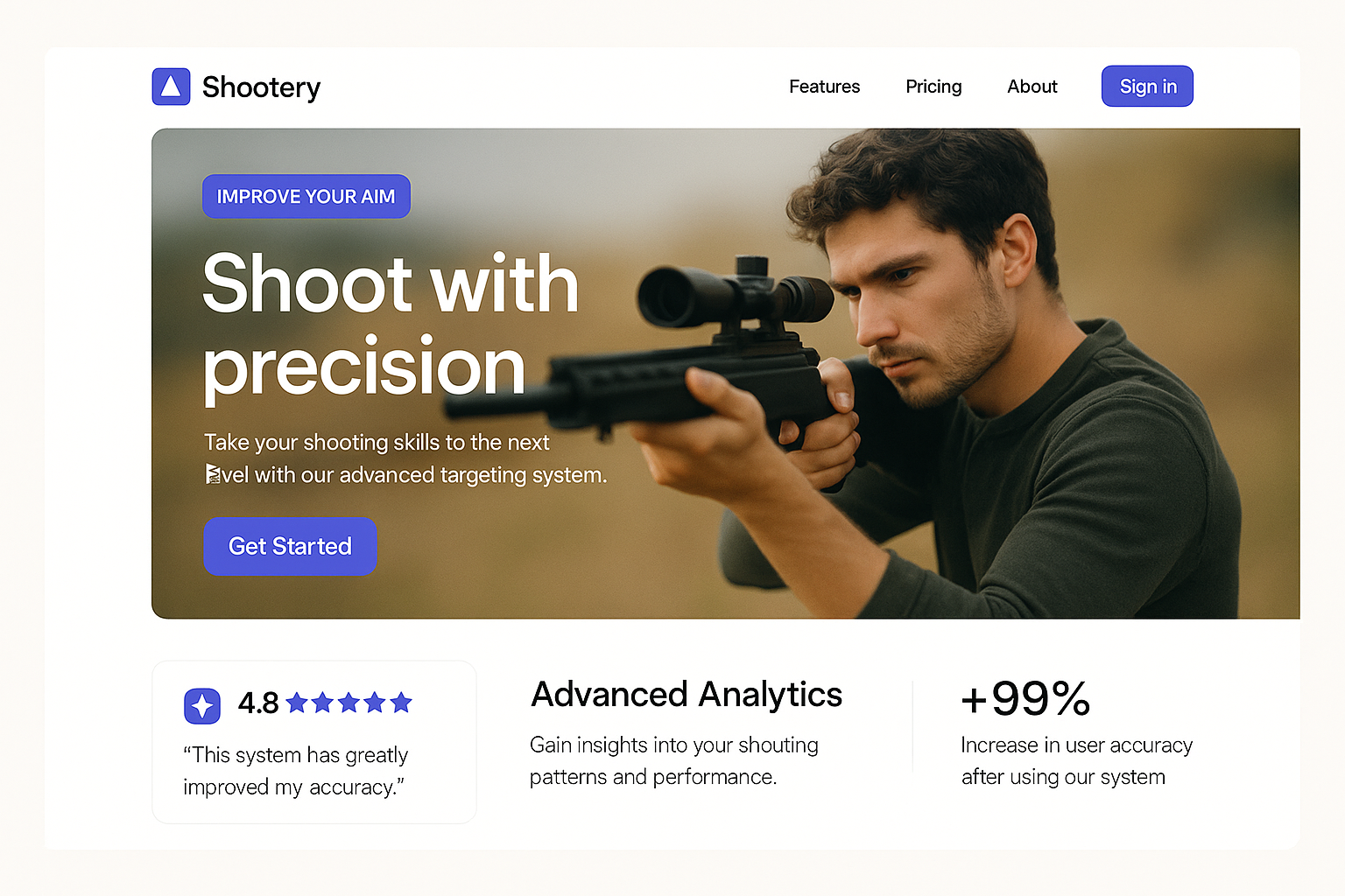 A modern landing page design featuring a shooter with a rifle, showcasing precision and advanced analytics. Includes rating, call-to-action, and structured layout.