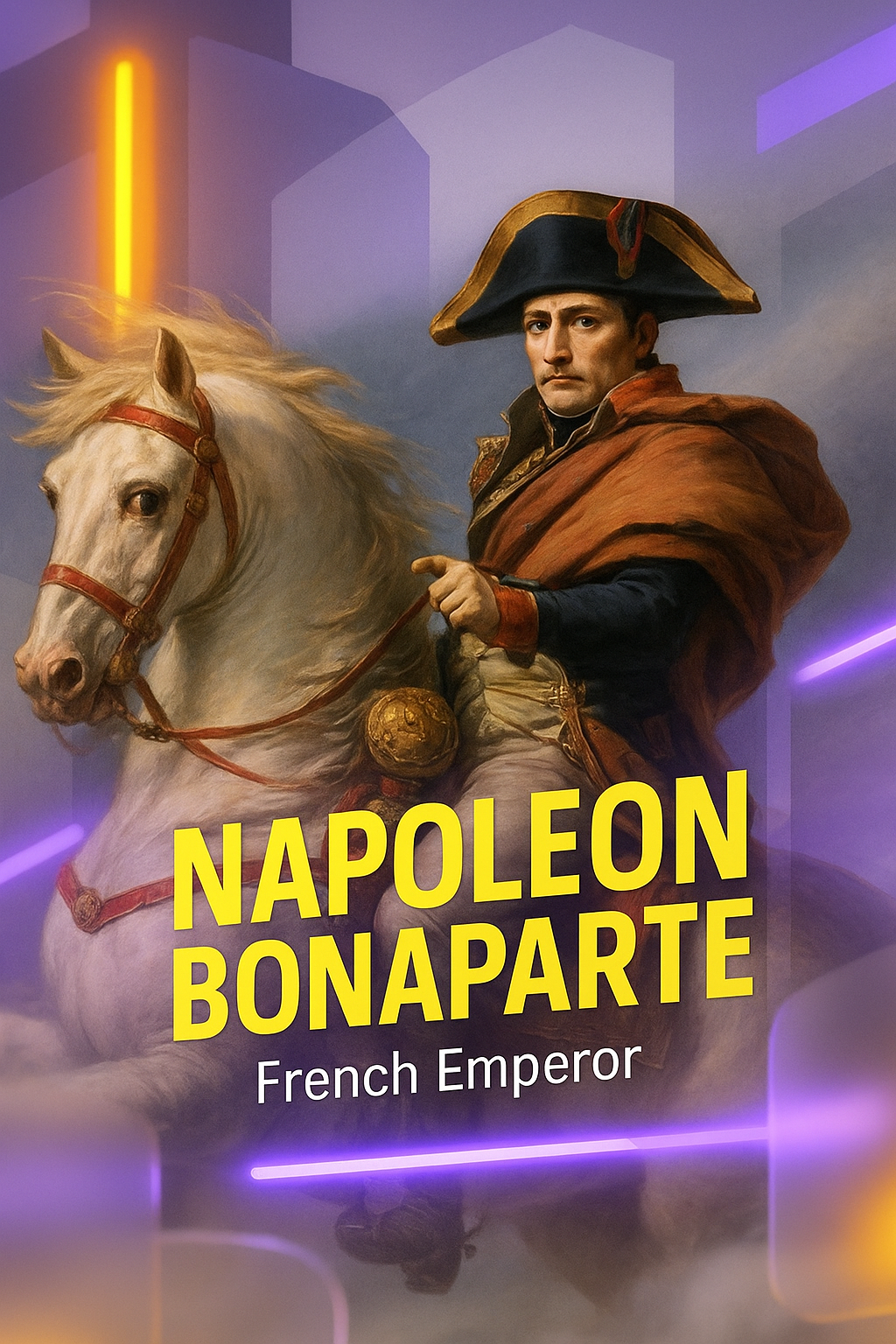 /Collection: /by davooda/Type: PNG/A striking digital portrait of Napoleon Bonaparte, the French Emperor, riding a horse. The modern graphic design elements enhance the historical theme, making it suitable for educational or promotional use.