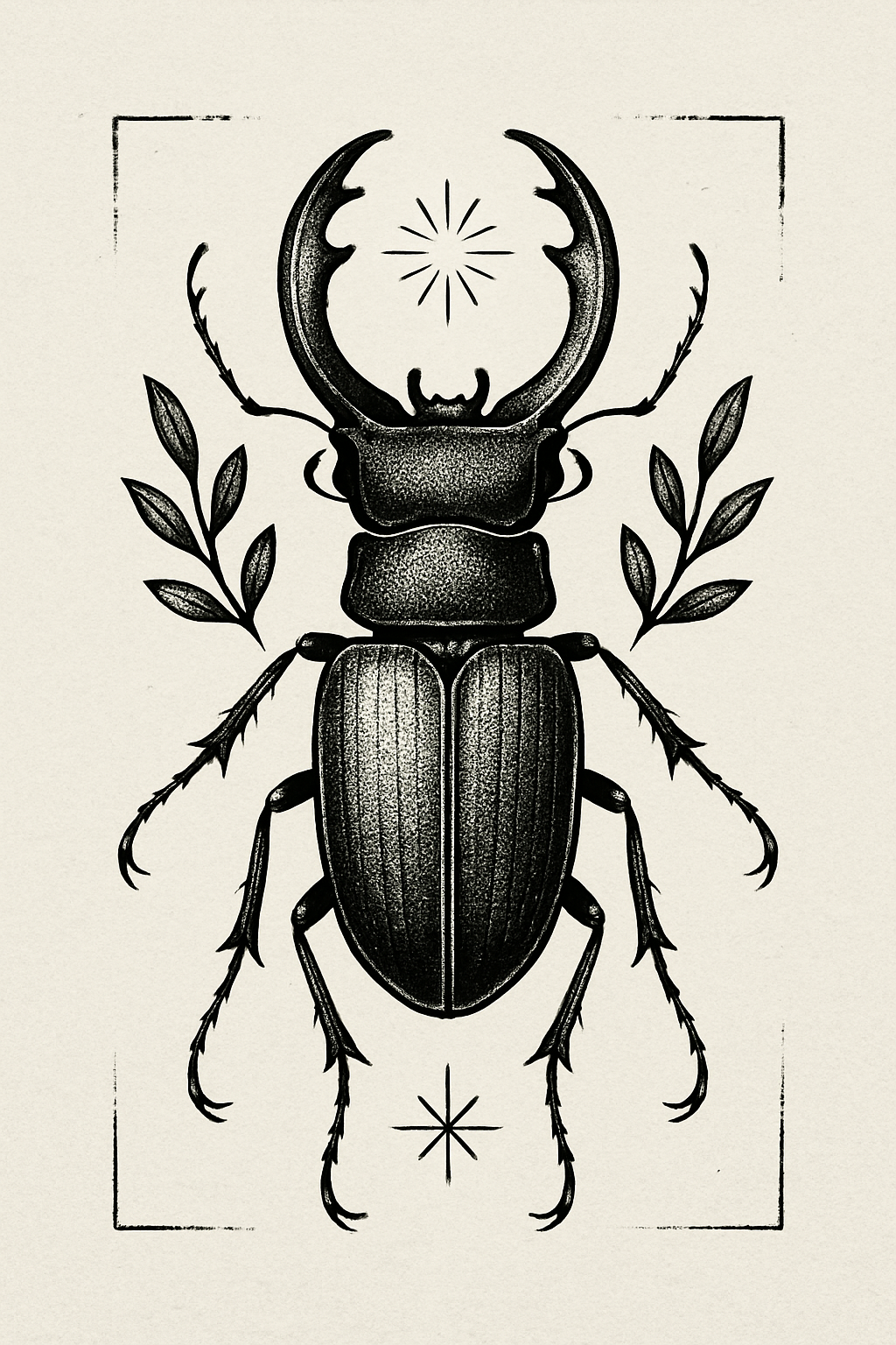 /Collection: /by davooda/Type: PNG/This is a detailed graphic illustration of a stag beetle, featuring decorative leaves and stars. It has a vintage style, suitable for nature-themed projects or art prints.