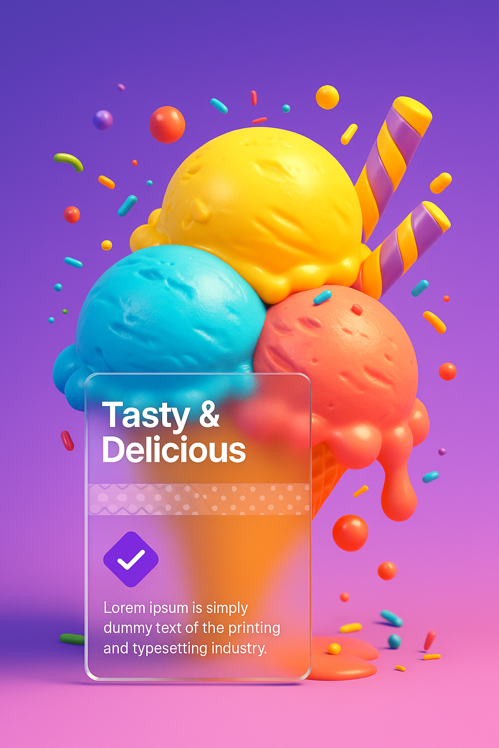 A visually striking 3D illustration of vibrant ice cream scoops in a cone, adorned with playful decorations and a transparent label showcasing text. The backdrop features a smooth gradient.