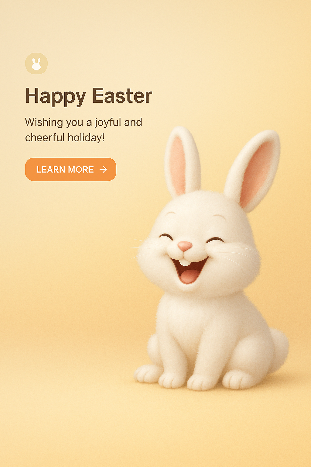 /Collection: /by davooda/Type: PNG/A charming 3D illustration of a cute white rabbit smiling brightly against a soft gradient background. The rabbit is positioned in a zoomed-out view, creating a cheerful Easter theme with text elements.