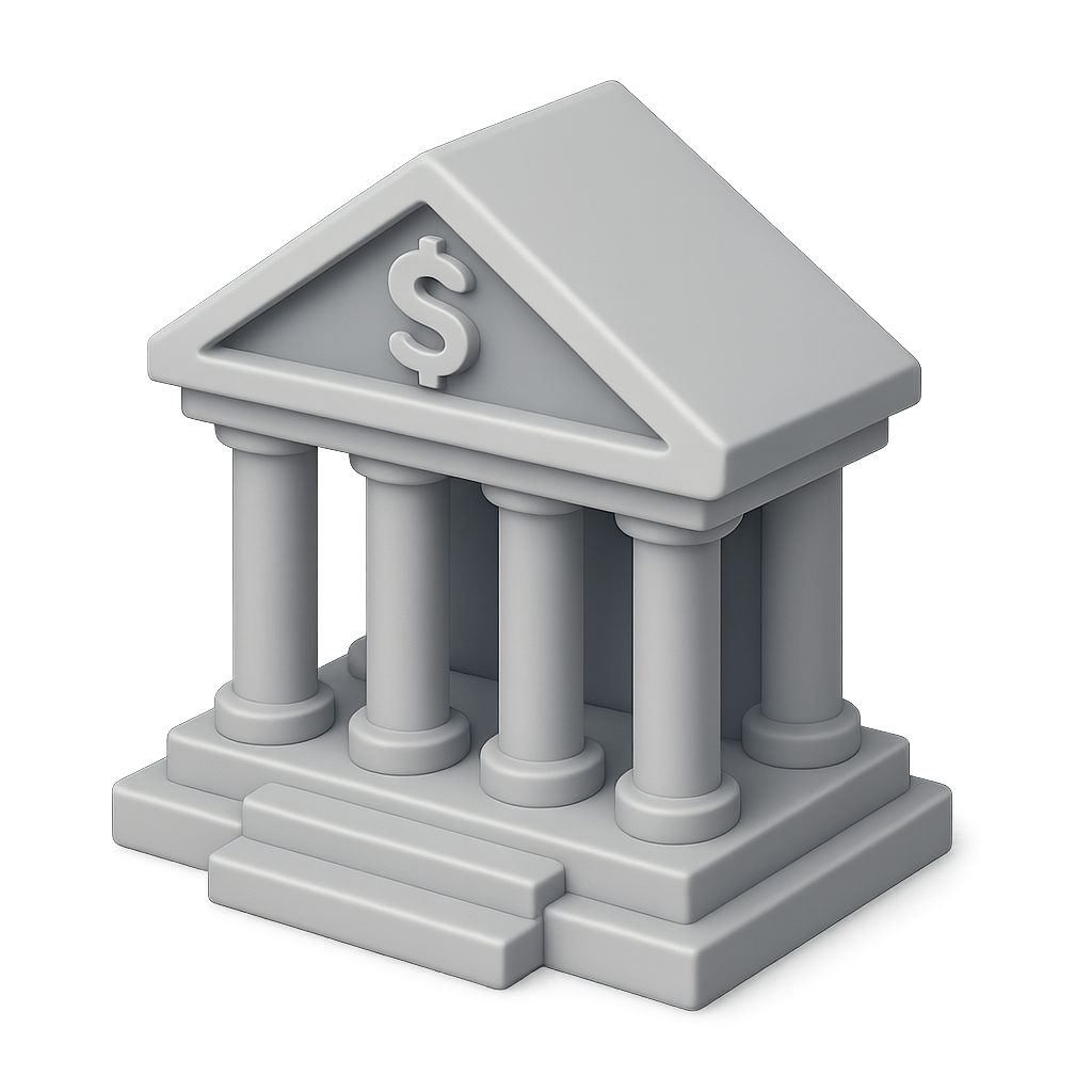 /Collection: /by davooda/Type: PNG/A sleek 3D representation of a bank building featuring classical columns and a dollar sign on its pediment. The design has a transparent background and is presented in an isometric view, showcasing its volumetric detail.