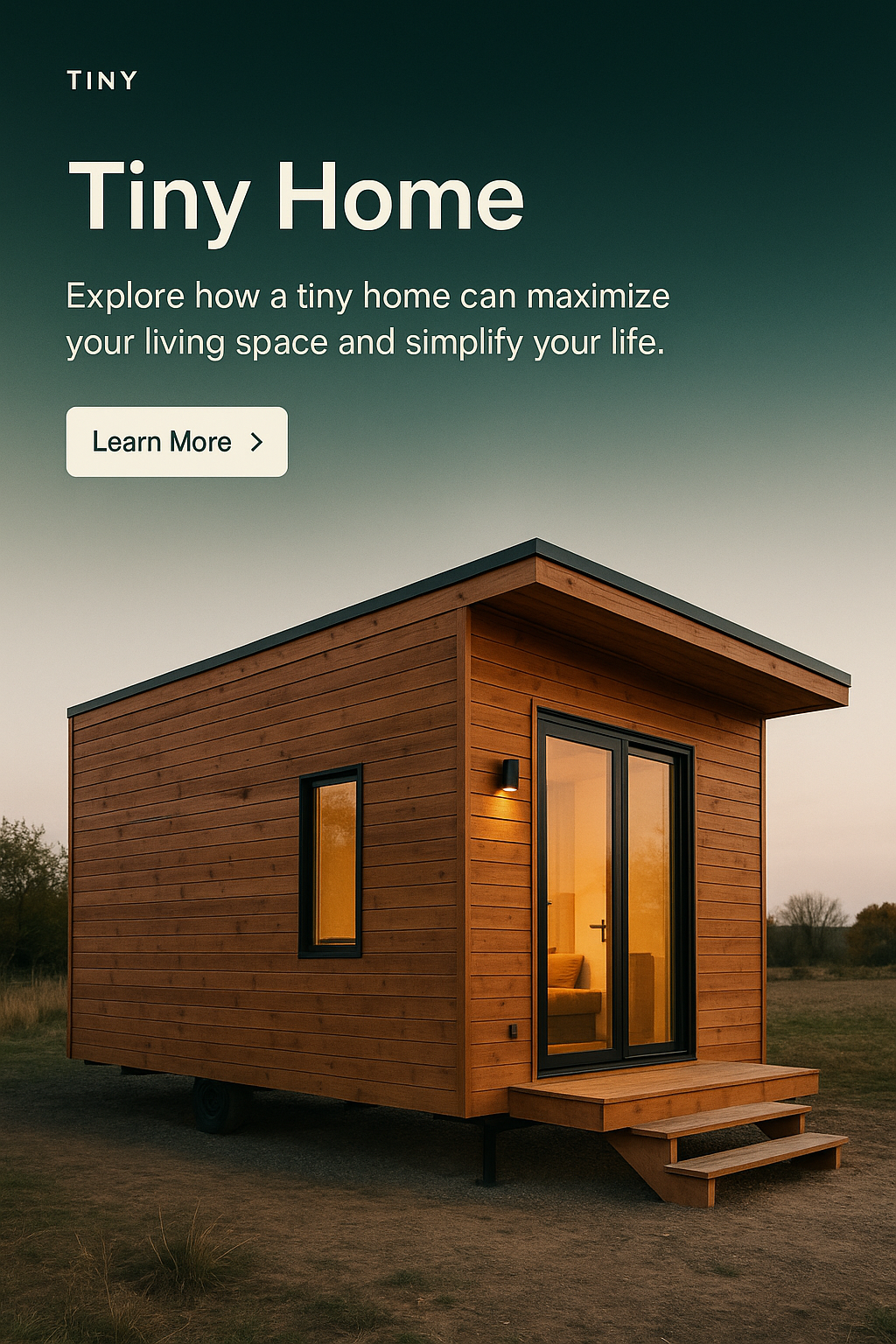 A beautifully designed tiny home showcasing modern architecture, with wooden exterior and large windows. The image promotes a lifestyle of simplicity and efficiency.