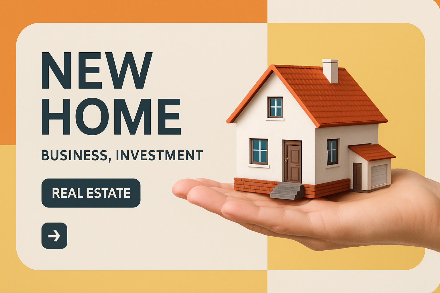 Modern Real Estate Promotional Graphic Featuring Urban Skyline