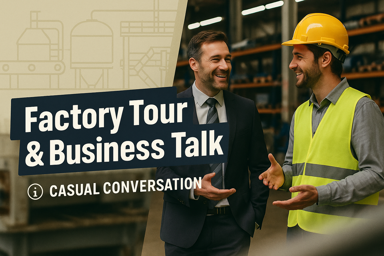 Image showcasing two professionals engaging in conversation during a factory tour, highlighting a blend of business and casual attire. Ideal for corporate communications or business presentations.