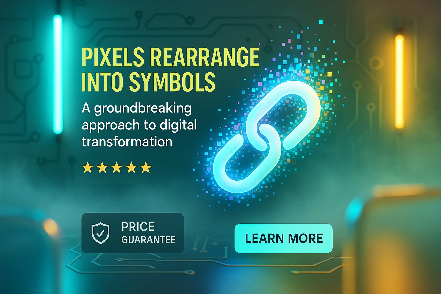 /Collection: /by davooda/Type: PNG/Vibrant promotional graphic highlighting digital transformation, featuring a chain link symbol and modern design elements. Ideal for tech-related marketing.