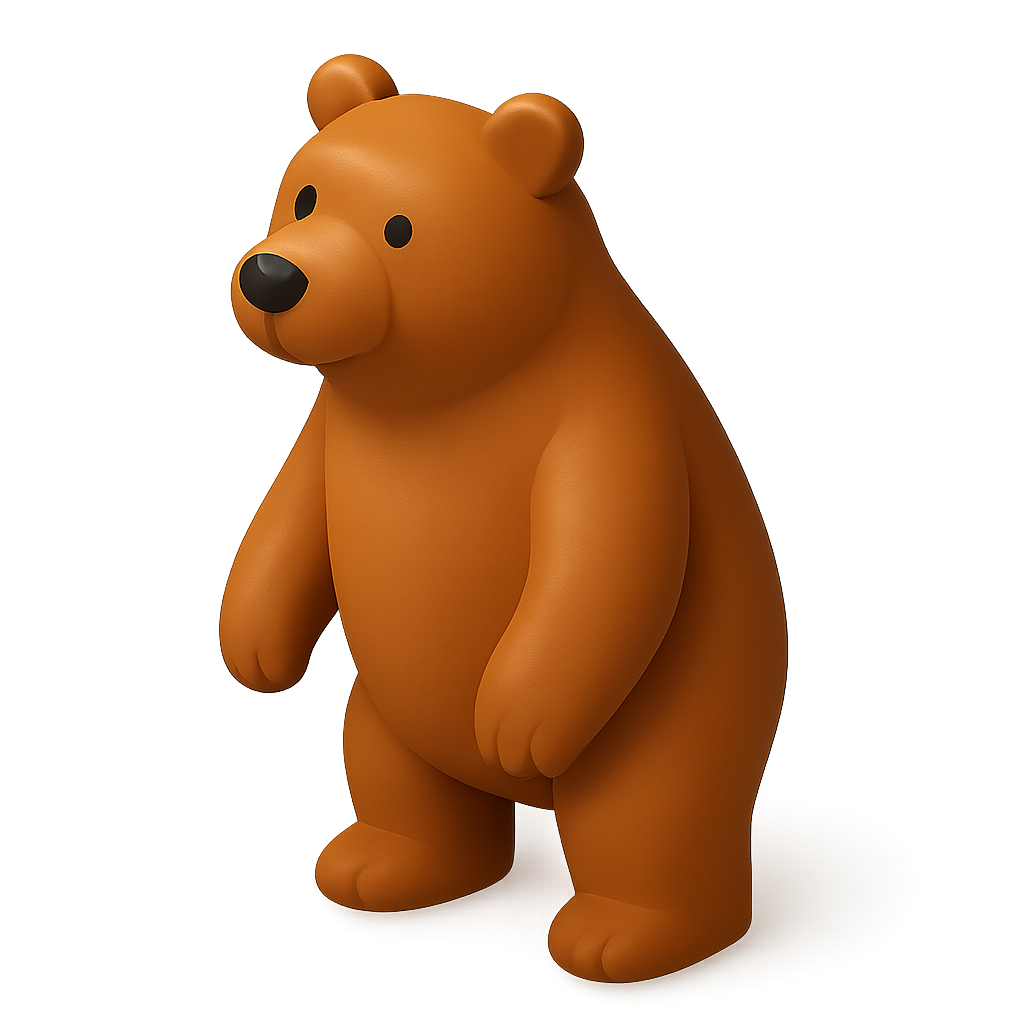 A charming 3D icon of a bear, featuring a rounded body and soft, cartoon-like features. This character is designed with a warm brown color and simplistic facial details, perfect for digital applications.
