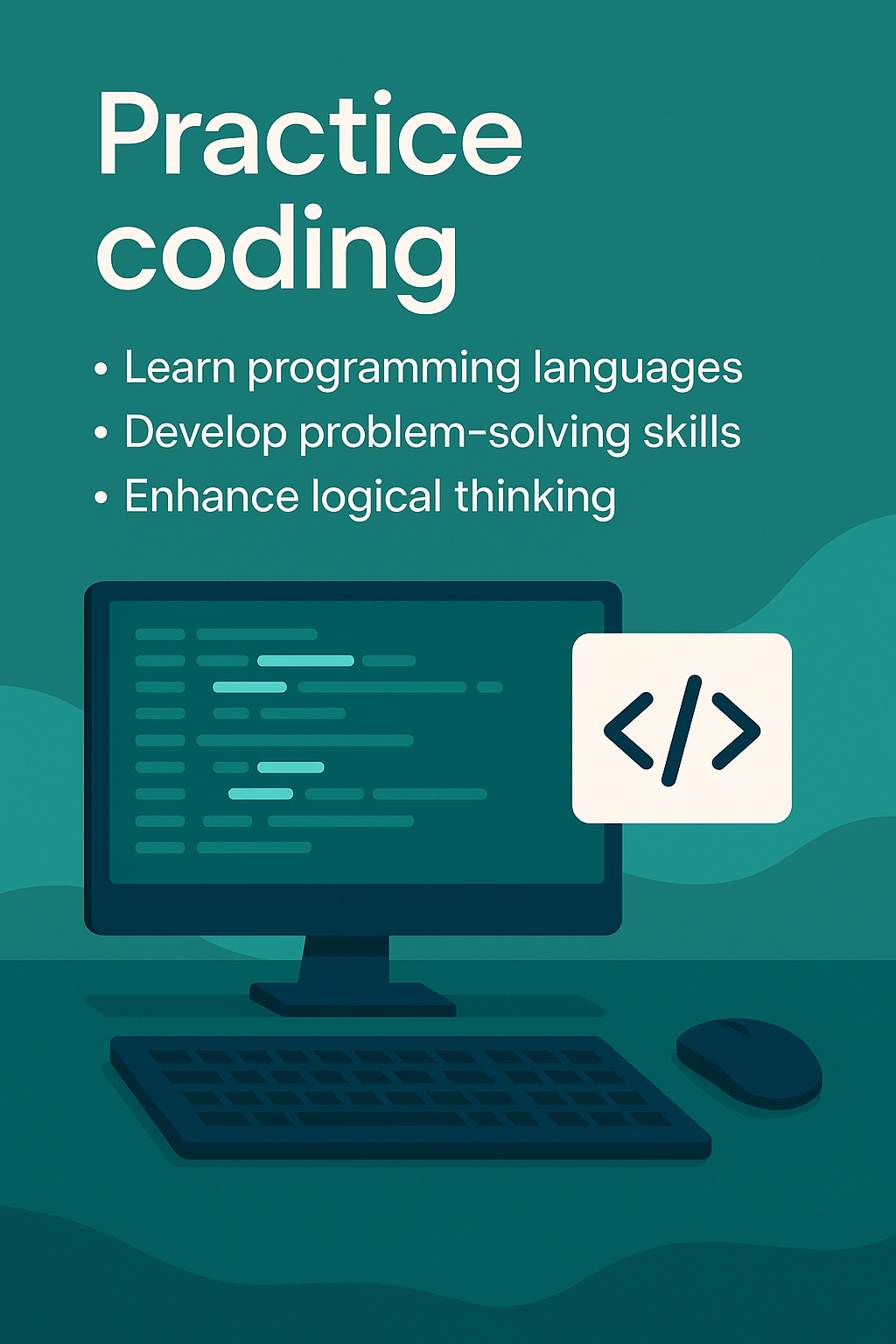 /Collection: /by davooda/Type: PNG/Informative illustration emphasizing coding practice with a computer setup, featuring key benefits related to programming skills. Ideal for educational platforms and tech blogs.