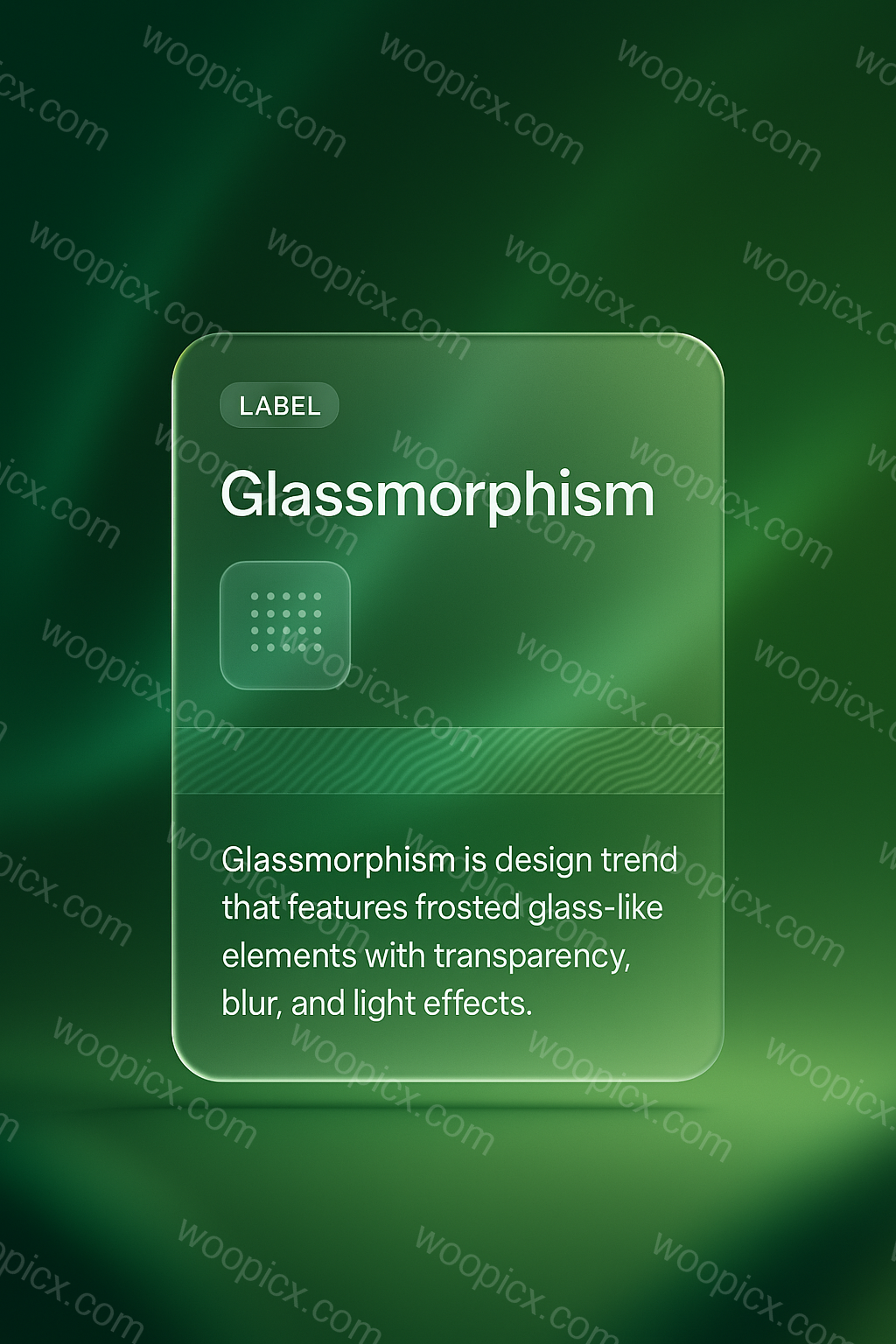 An abstract design featuring a soft green gradient background with a glassmorphism label. The label includes a title and description, showcasing a modern aesthetic.