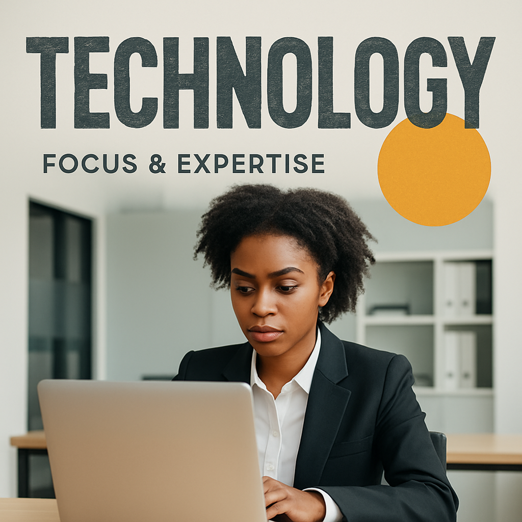 Engaging social media graphic illustrating a professional woman working on a laptop, emphasizing technology with bold typography and a minimalist design. Ideal for tech-related promotions.