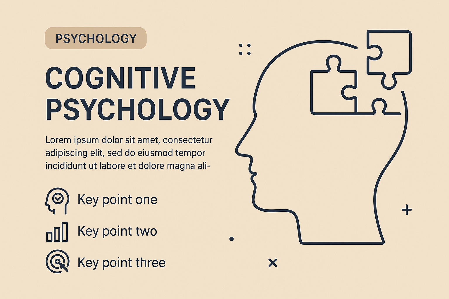 Minimalist infographic illustrating cognitive psychology concepts, featuring a profile illustration and key points, suitable for educational content.