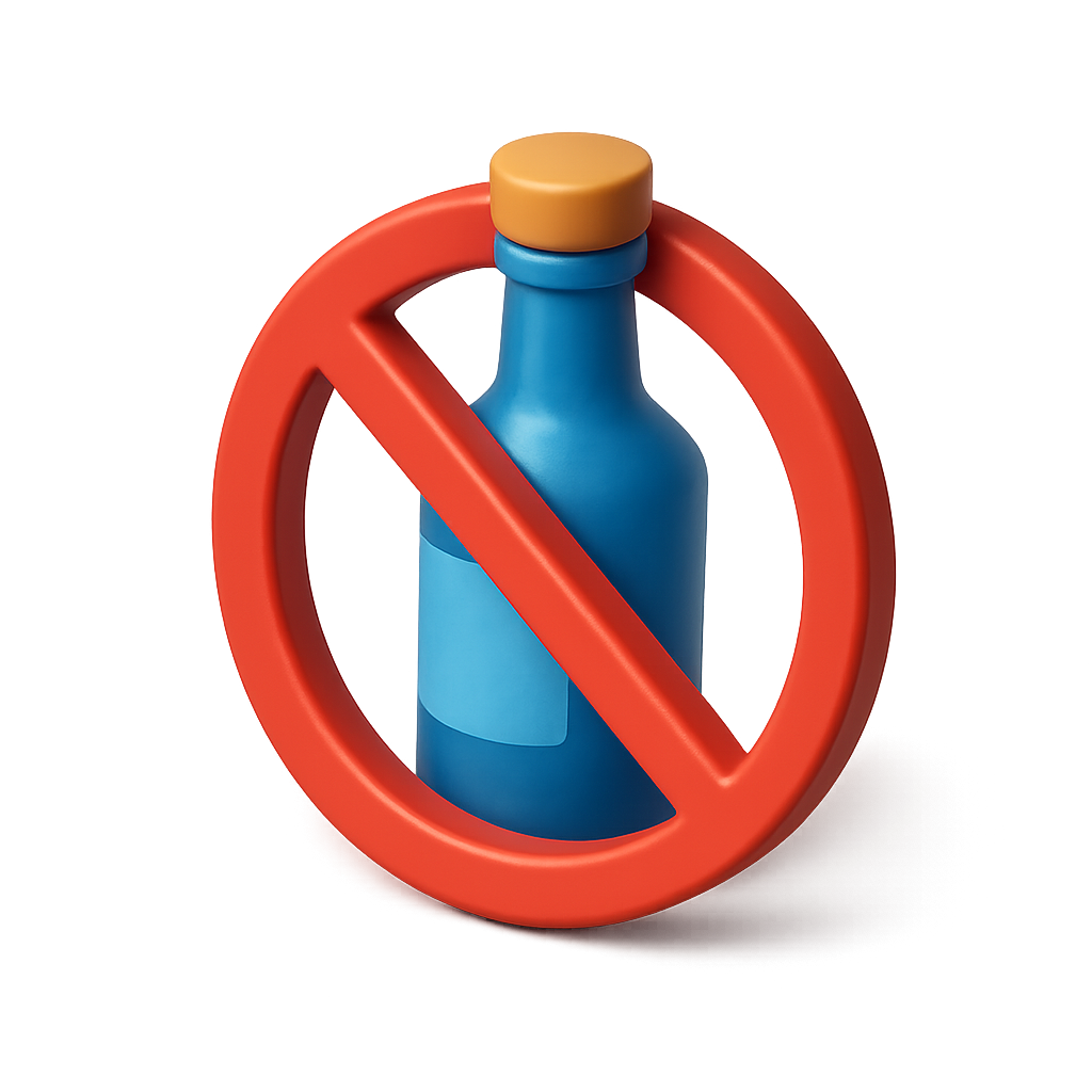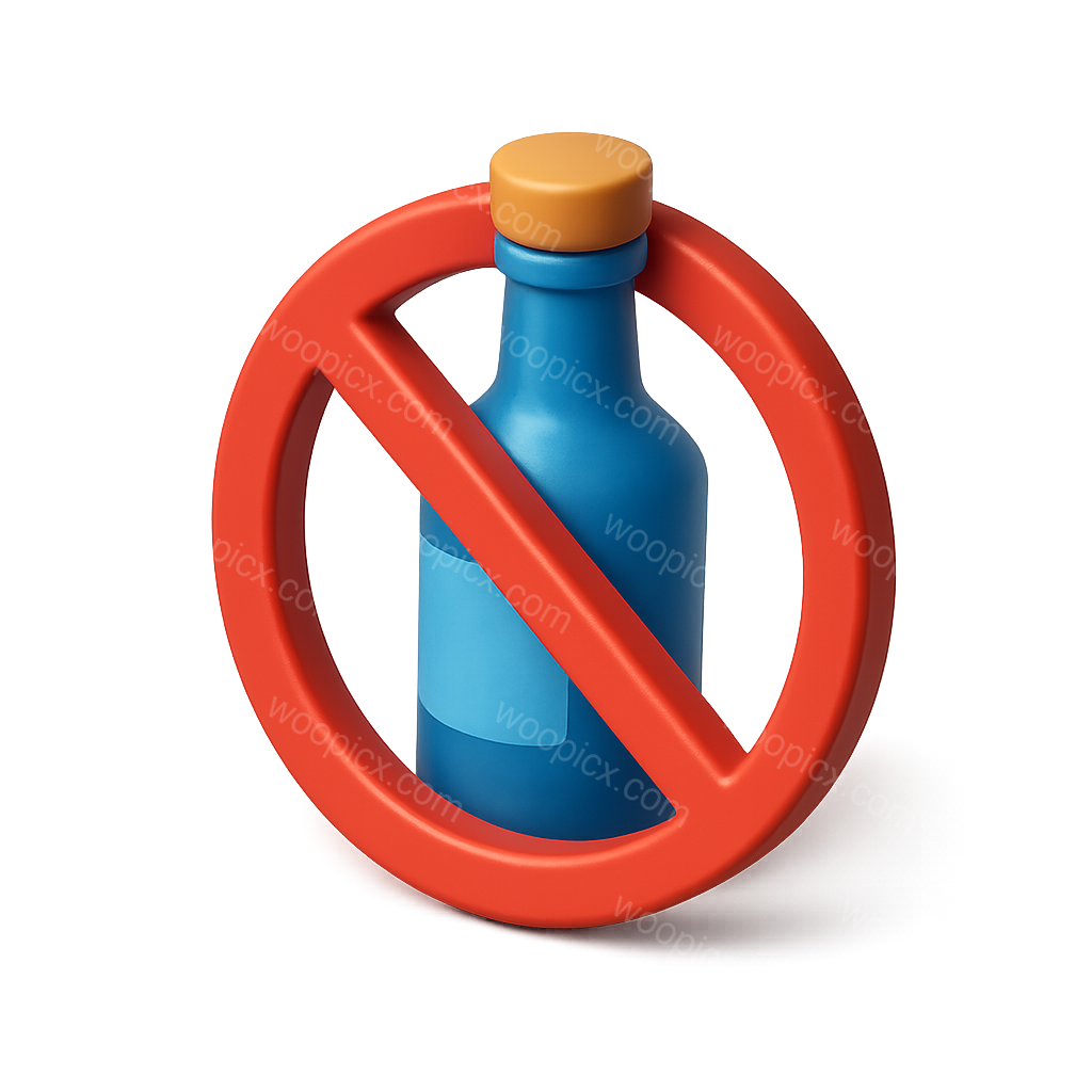 This image features a 3D icon representing alcohol-free, showcasing a blue bottle encircled by a red prohibition sign. The design emphasizes a modern, isometric style.