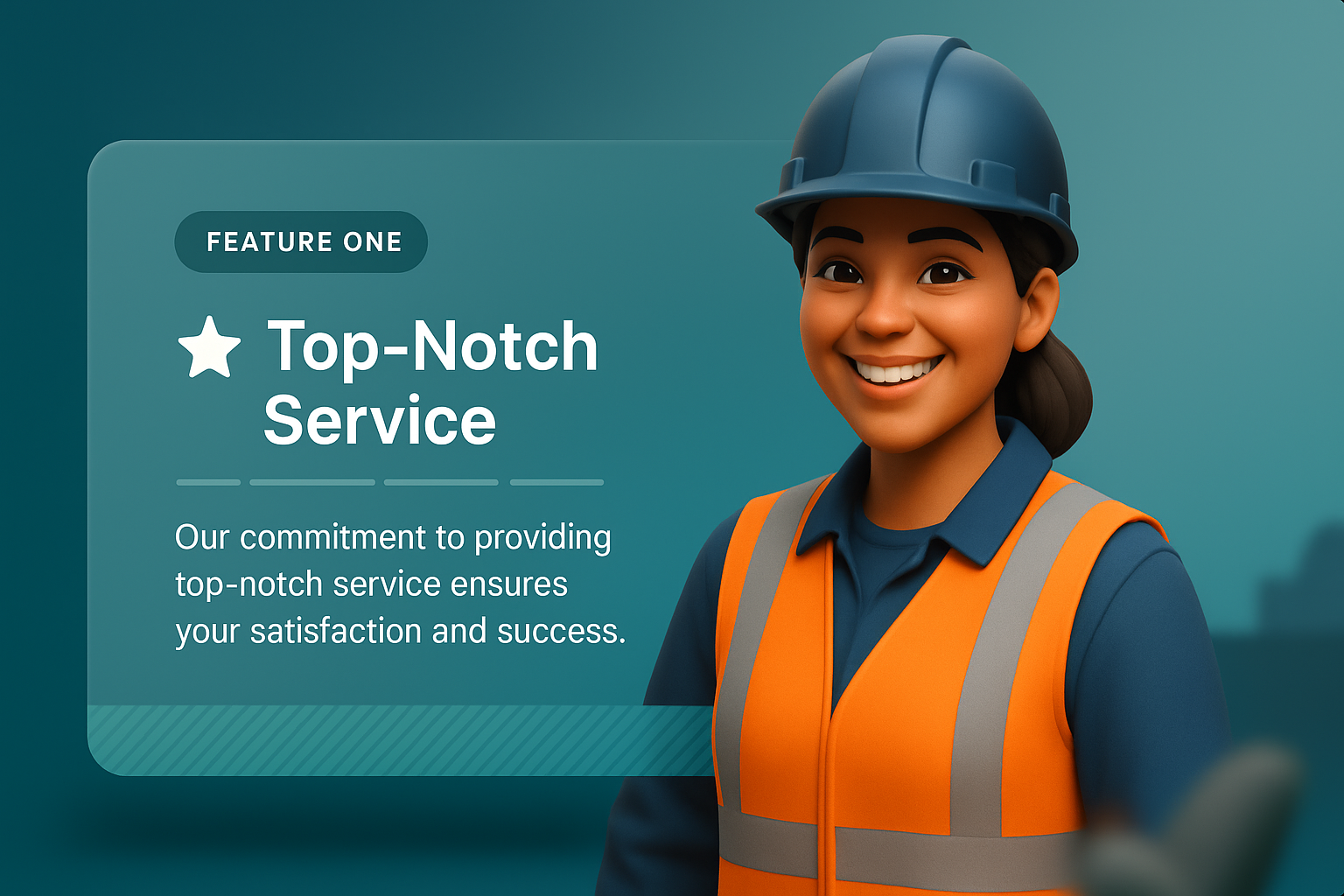 /Collection: /by davooda/Type: PNG/A female construction worker in PPE smiles brightly, emphasizing top-notch service. The background features a smooth gradient, enhancing the 3D illustration's realism.