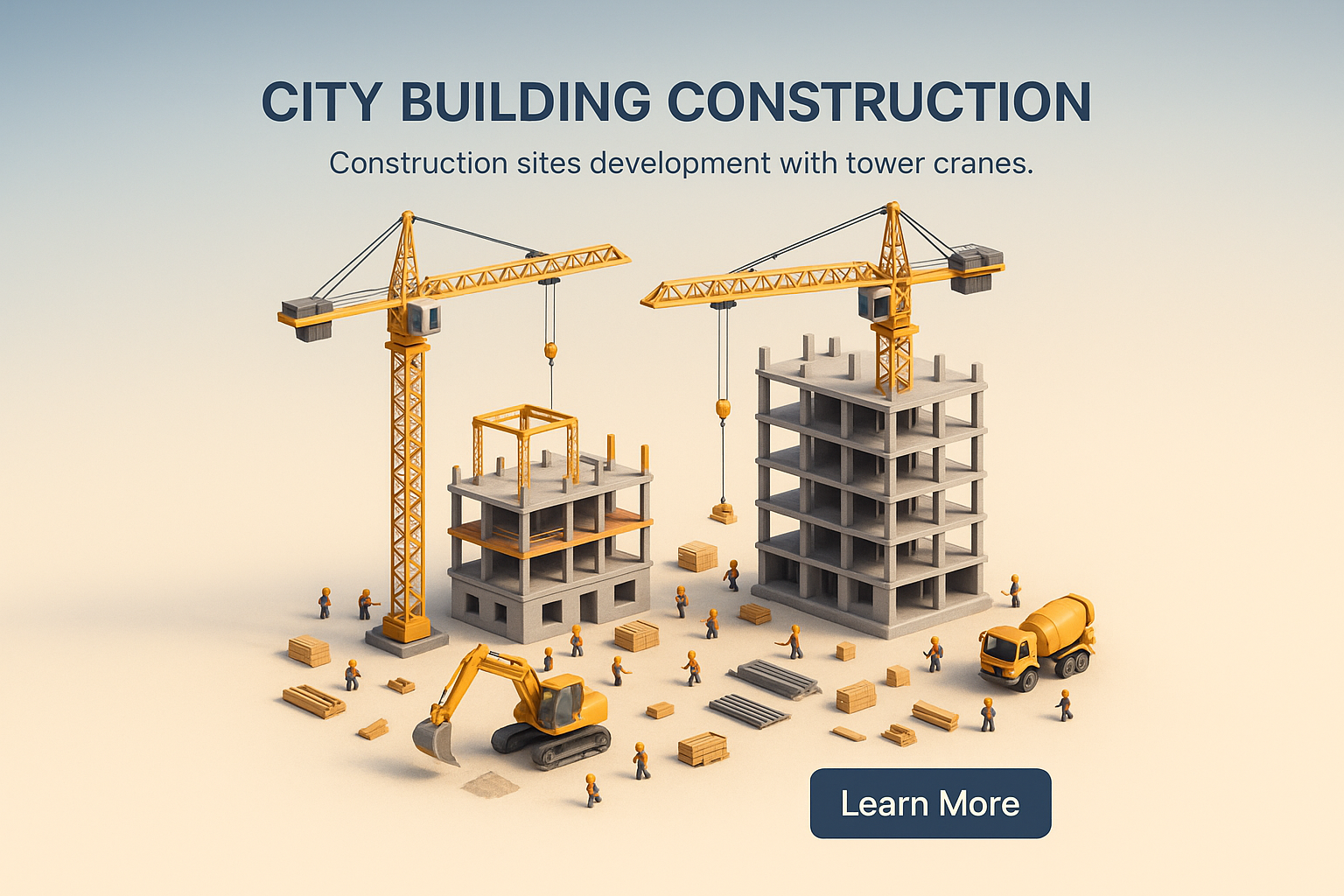 /Collection: /by davooda/Type: PNG/A realistic 3D illustration showing a city construction site with tower cranes, workers, and machinery. The scene is zoomed out, depicting the activity from a high perspective.