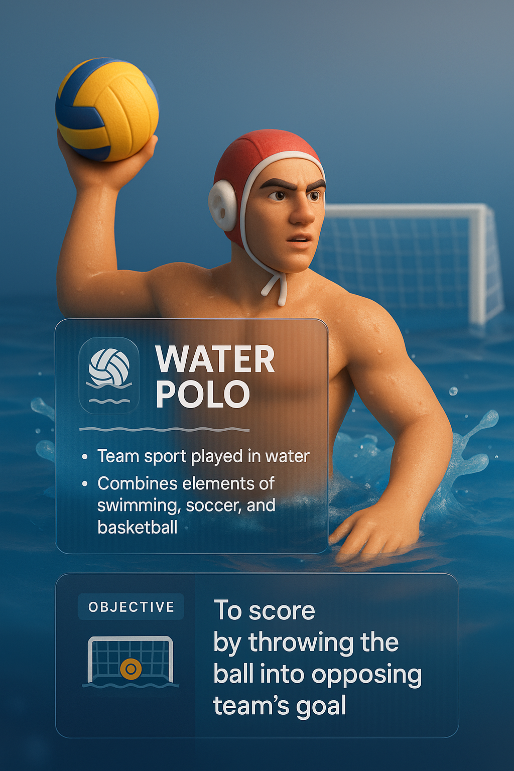 /Collection: /by davooda/Type: PNG/A vibrant 3D illustration of a water polo player in action, surrounded by a water backdrop. The image features informative text overlays and a cohesive design.
