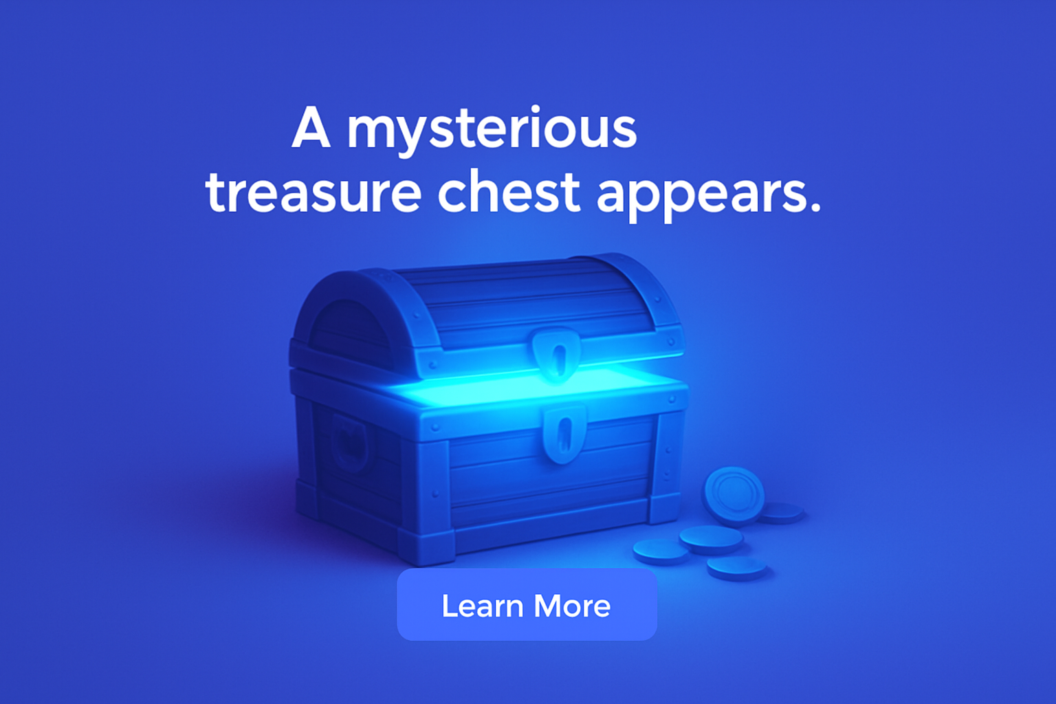 A visually striking image showcasing a glowing blue treasure chest against a vibrant blue background. The chest emits a soft, fluorescent light, creating an enchanting atmosphere.