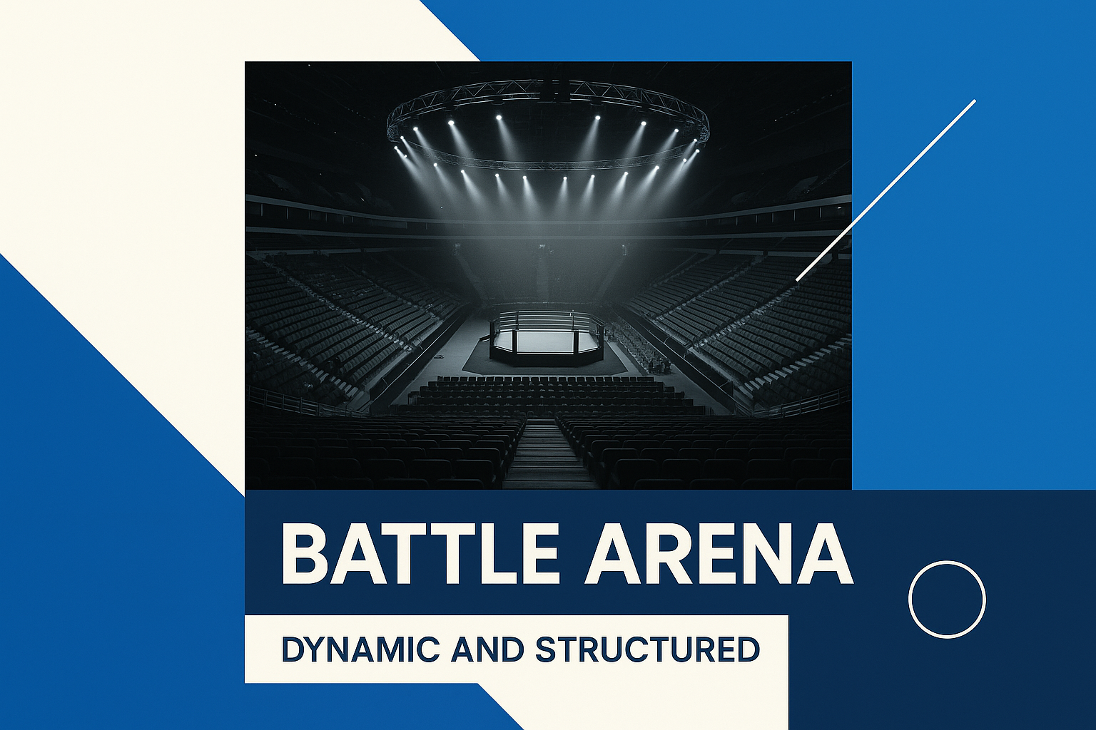 /Collection: /by davooda/Type: PNG/A modern and energetic visual of a battle arena, featuring clear color blocks and a central focal point. The design incorporates typography and geometric shapes in a balanced layout.