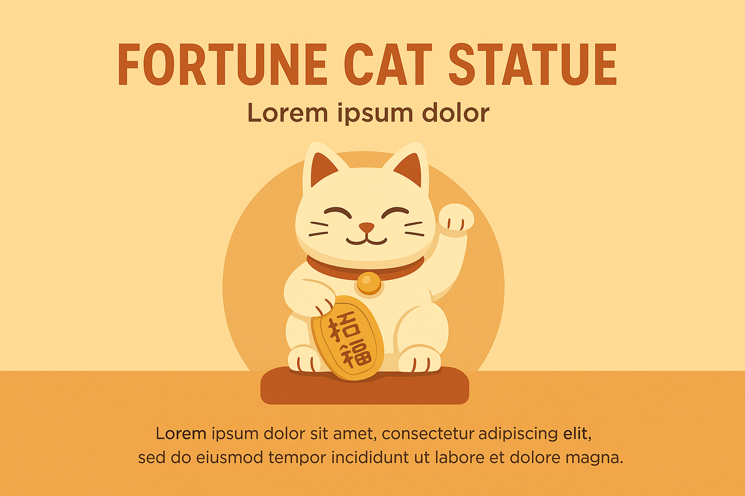 /Collection: /by davooda/Type: PNG/A delightful illustration of a fortune cat statue with a warm color scheme. The cat holds a coin, symbolizing prosperity, surrounded by a balanced composition and engaging typography.
