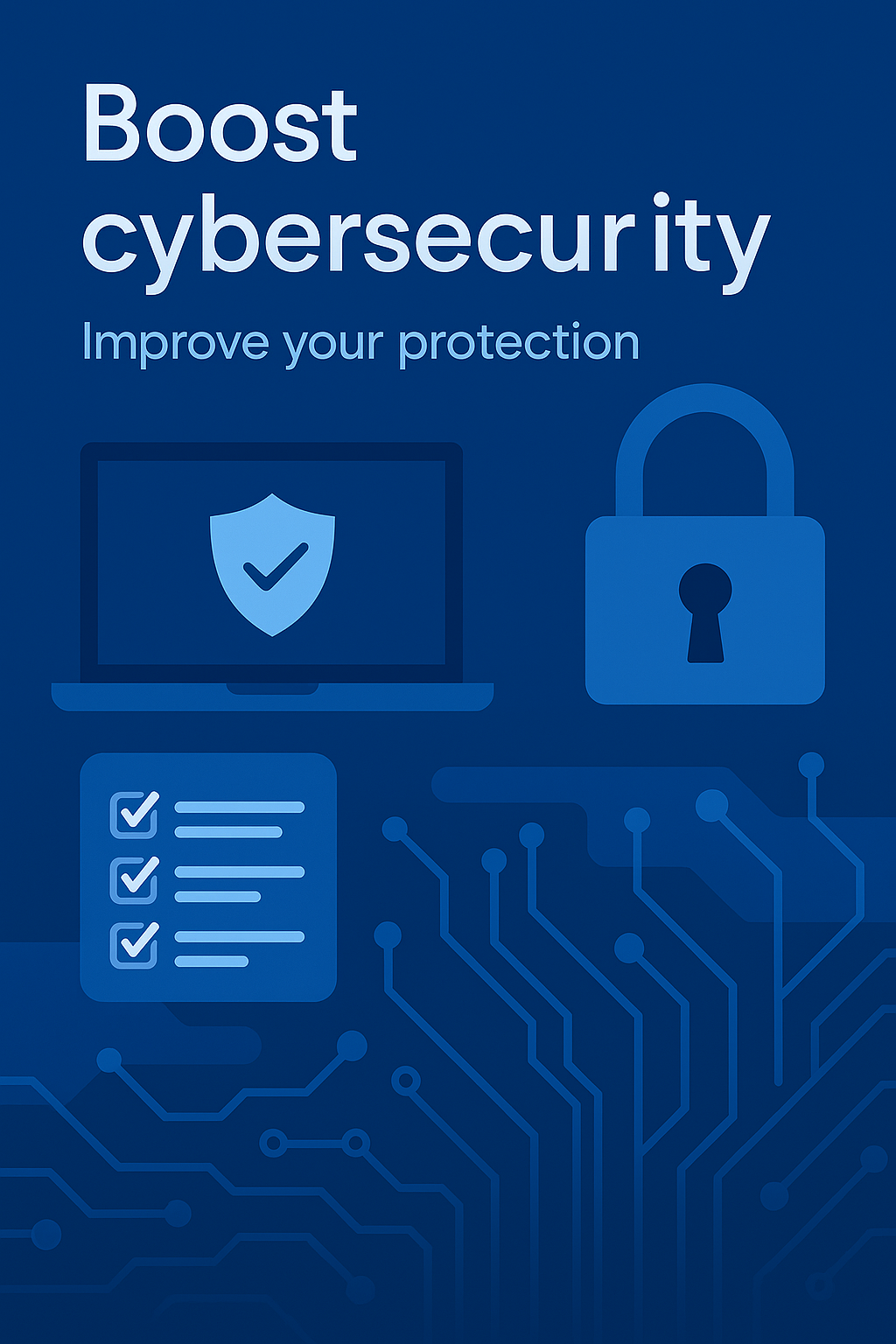 /Collection: /by davooda/Type: PNG/Informative digital graphic focused on enhancing cybersecurity. Features modern design elements like a laptop and padlock, ideal for tech marketing and awareness campaigns.