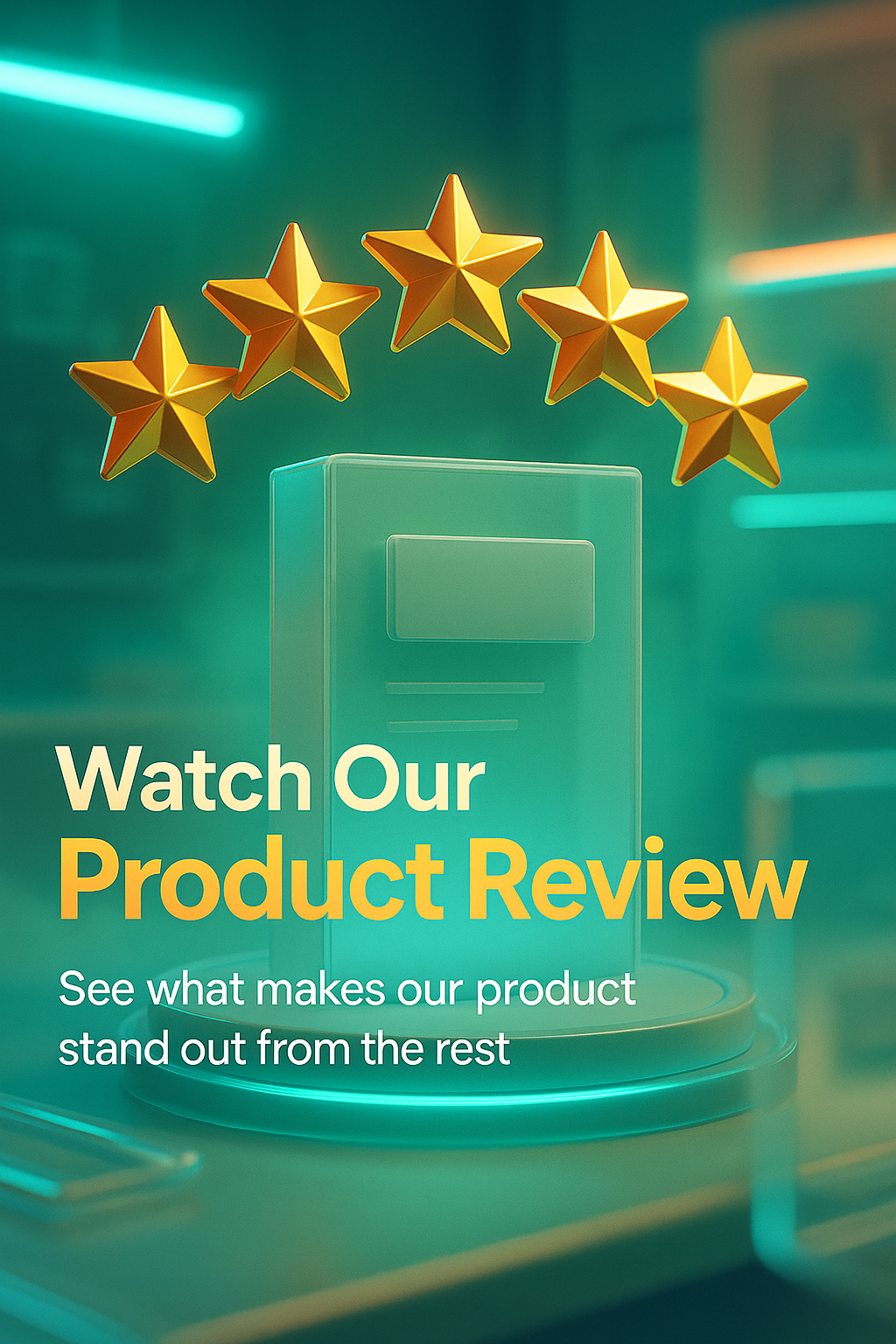 Dynamic promotional graphic designed for a product review, featuring star ratings and engaging typography, ideal for marketing and online reviews.