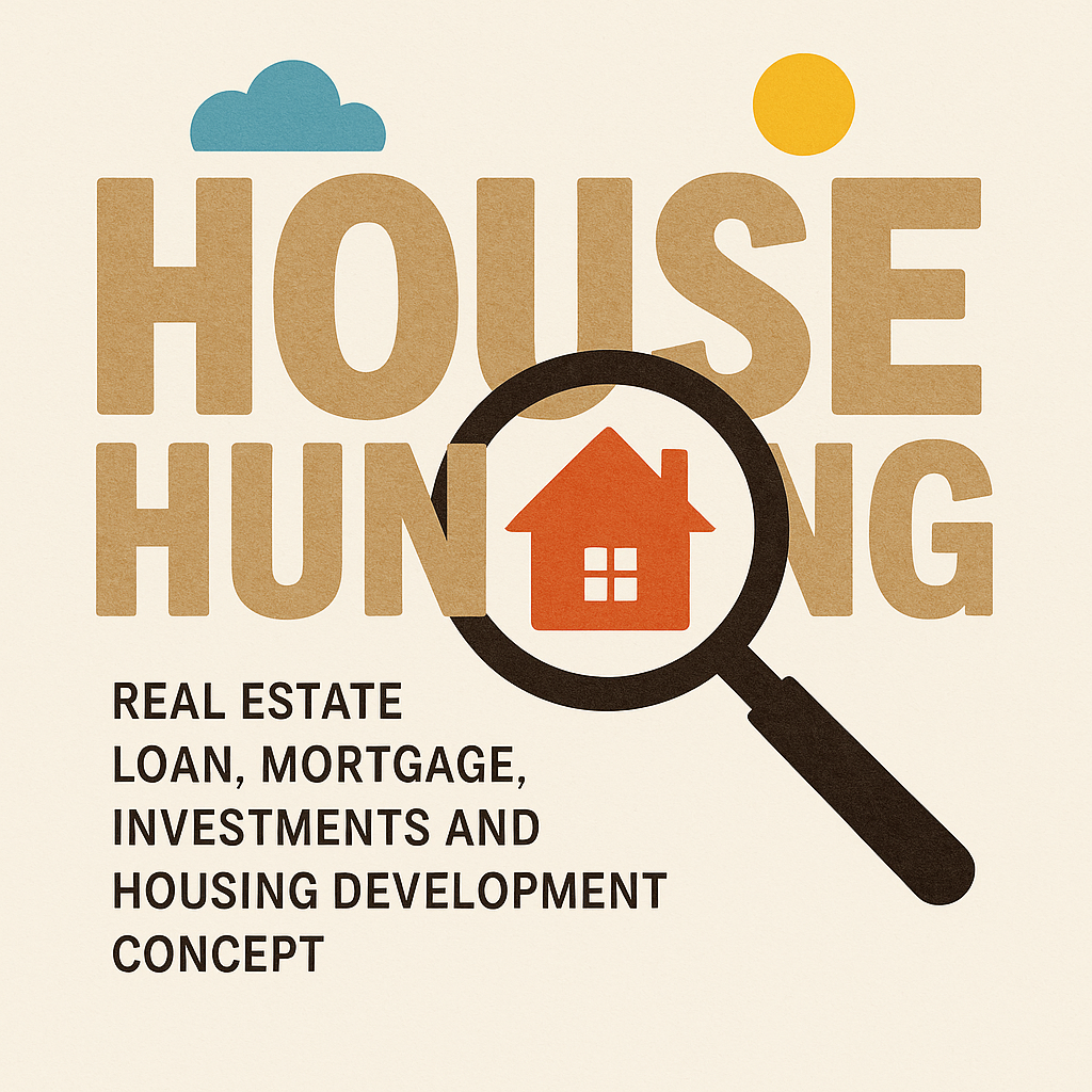Creative graphic representing the concept of house hunting with bold typography and a magnifying glass, ideal for real estate marketing and promotional materials.