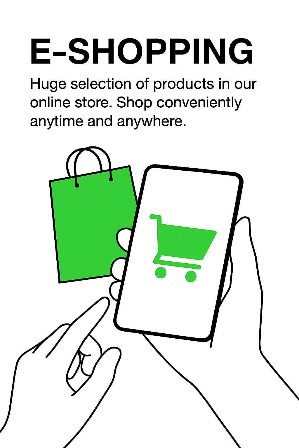 Minimalistic graphic illustrating e-shopping concept with a smartphone and shopping bag, ideal for online retail marketing and social media campaigns.