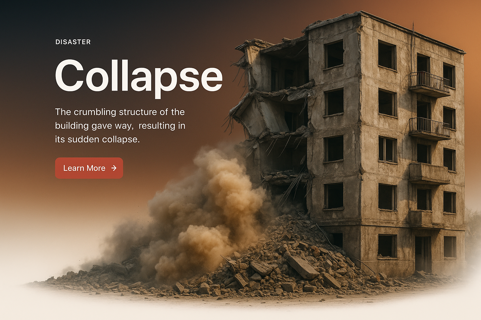 A visually striking web design concept showcasing a building collapse with a gradient background. Features a clear action button and concise text for effective user engagement.